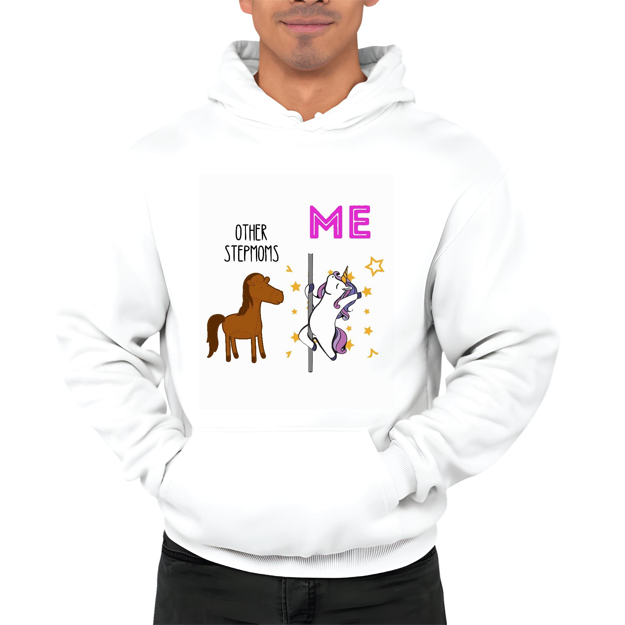 Mothers Day Gift for Stepmom Humorous Unicorn Saying for Mom Stepmother White and Muticolor Unisex Hoodie