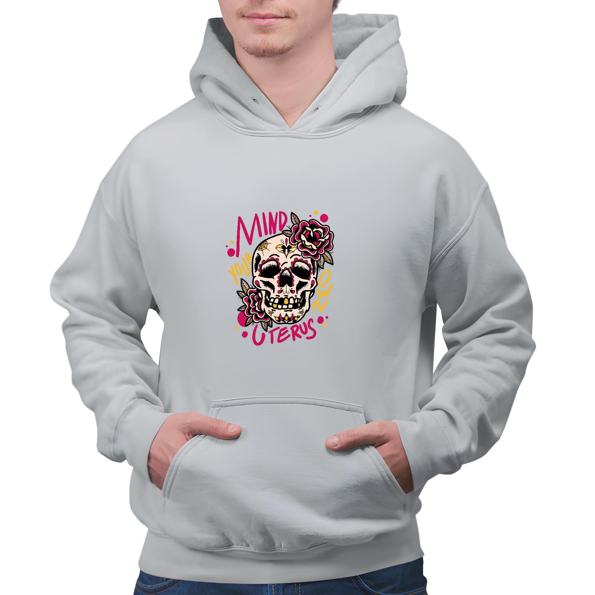 Mind Your Own Uterus Floral Skull Gift for Women Unique and Inspirational Gray and Muticolor Unisex Hoodie