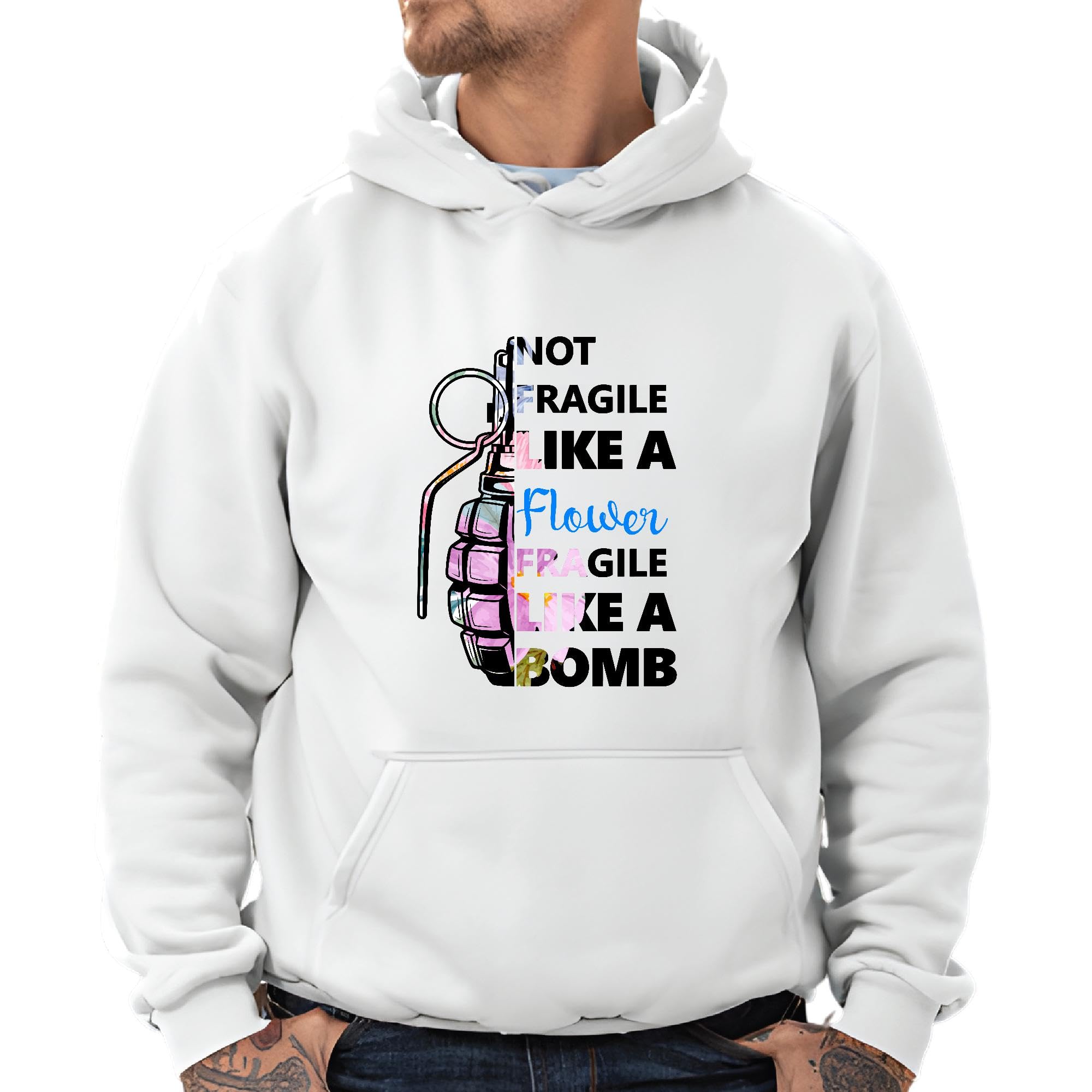 Motivational for Ladies Women Feminist Not Fragile Like a Flower Fragile Like a Bomb Gray and Muticolor Unisex Hoodie