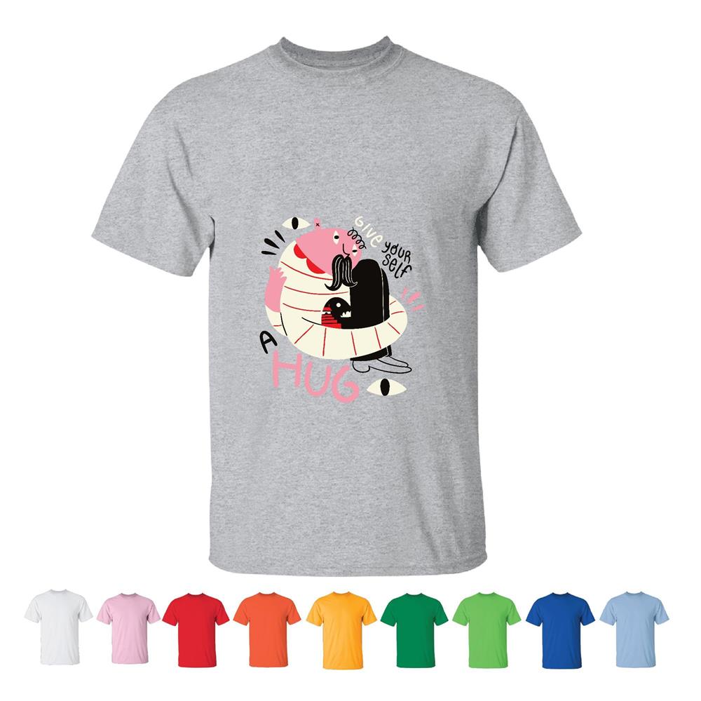 Motivational Gift with Abstract Creature Hugging Itself and Quote Give Yourself a Hug Men Women White Gray T shirt