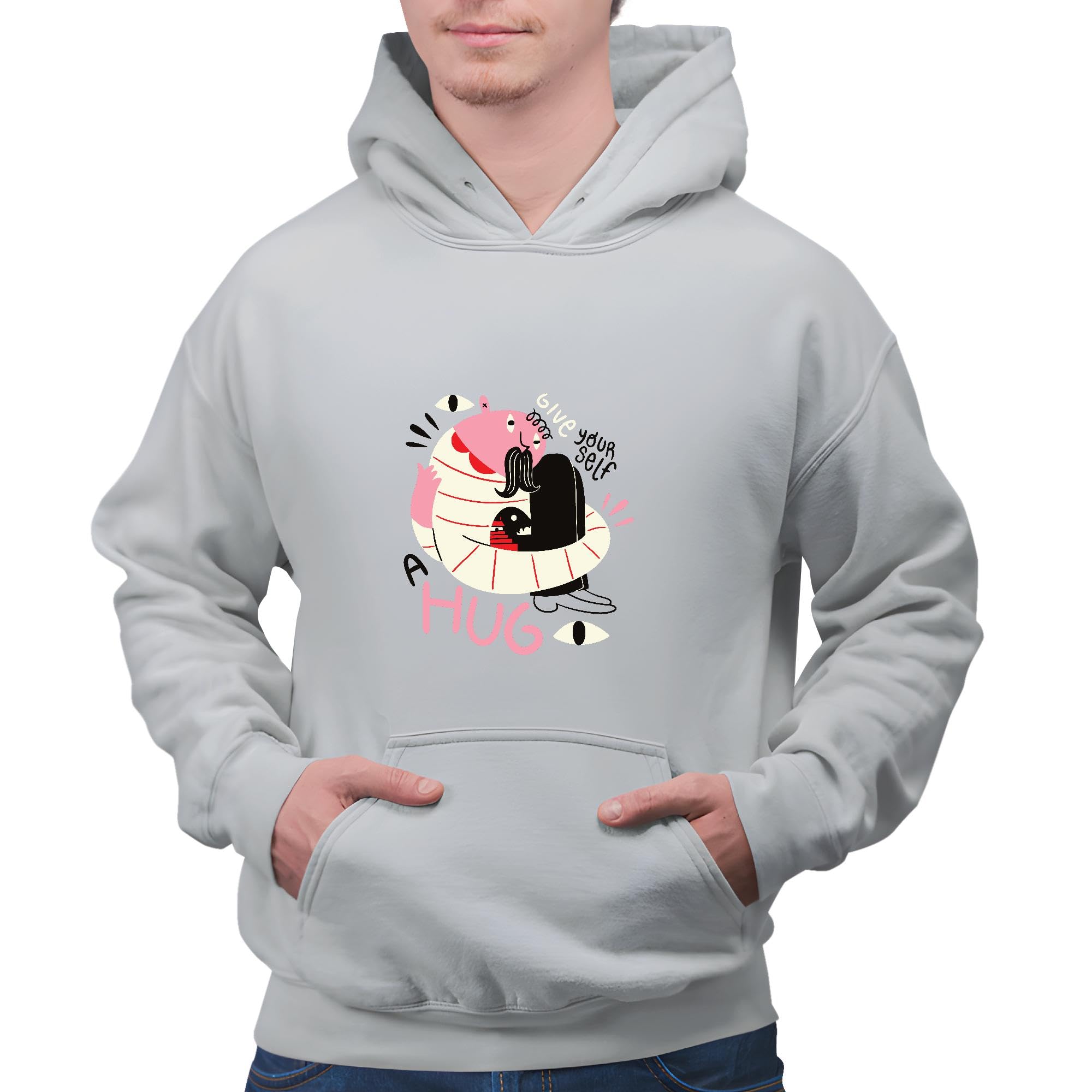 Motivational Gift with Abstract Creature Hugging Itself and Quote Give Yourself a Hug Gray and Muticolor Unisex Hoodie