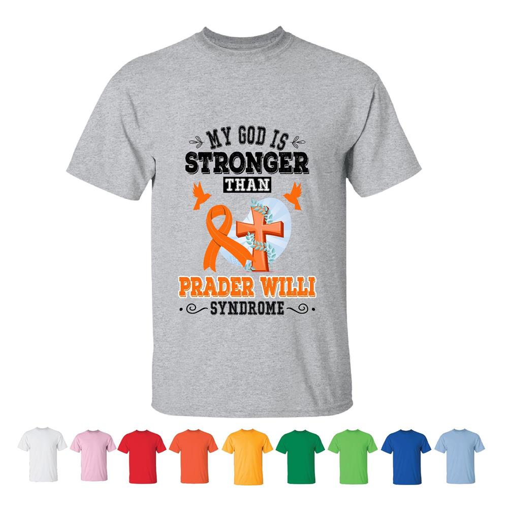 My God is stronger than Prader Willi Syndrome thankful saying from Christian Jesus lover Men Women White Gray T shirt