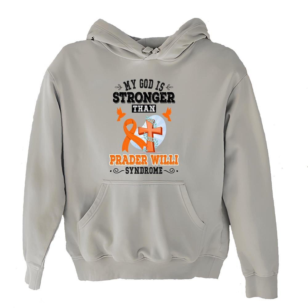 My God is stronger than Prader Willi Syndrome thankful saying from Christian Jesus lover Gray and Muticolor Unisex Hoodie
