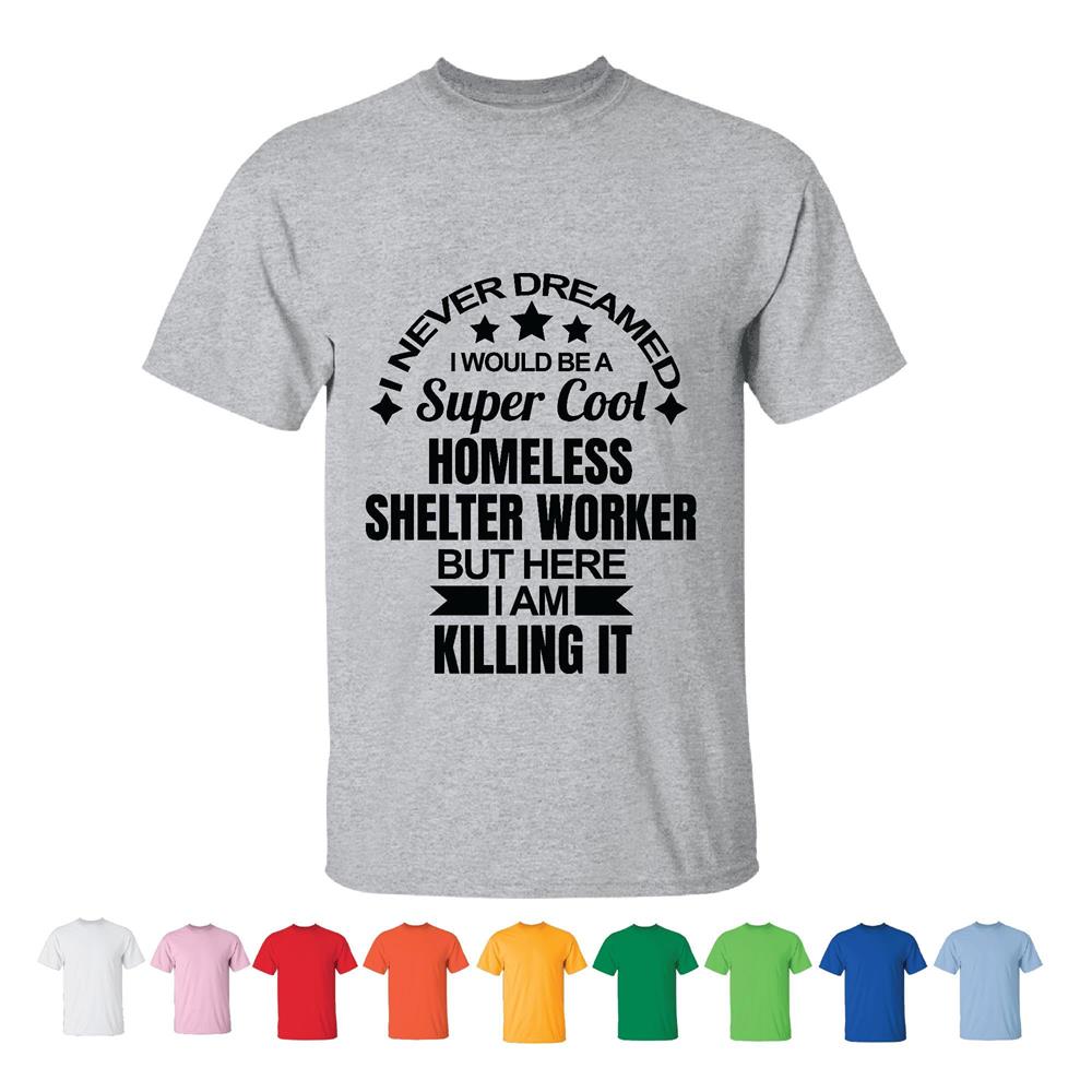 Never Dreamed Id Be Here Killing It Inspirational Gift for Homeless Shelter Workers Men Women White Gray T shirt