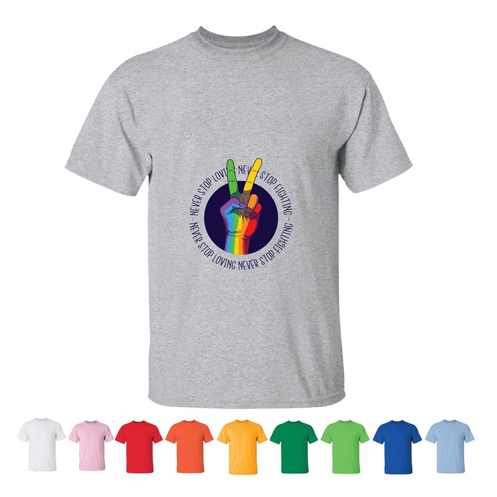 Never Stop Loving Never Stop Fighting Pride Peace Rainbow Gift for LGBTQ+ Supporters Men Women White Gray T shirt