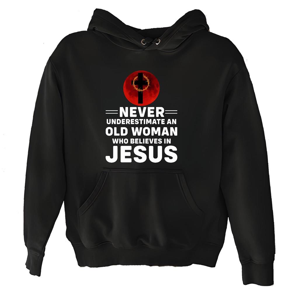 Never Underestimate an old Woman who believes in Jesus God lover Black and Muticolor Unisex Hoodie