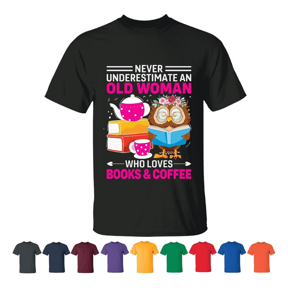 Never Underestimate Old Woman Who Loves Books Coffee Reader Gift Fun Humor Saying Men Women Black T shirt