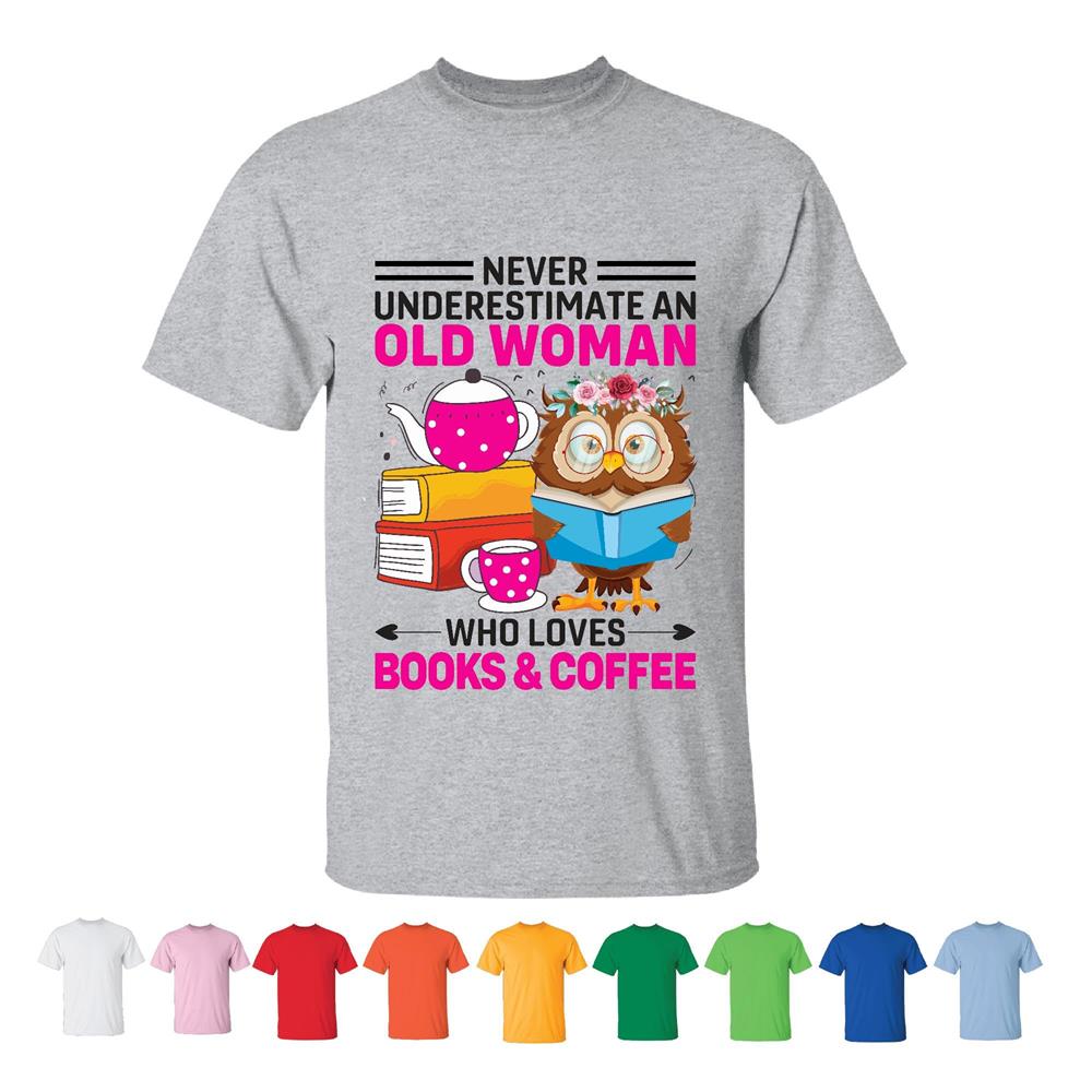 Never Underestimate Old Woman Who Loves Books Coffee Reader Gift Fun Humor Saying Men Women White Gray T shirt