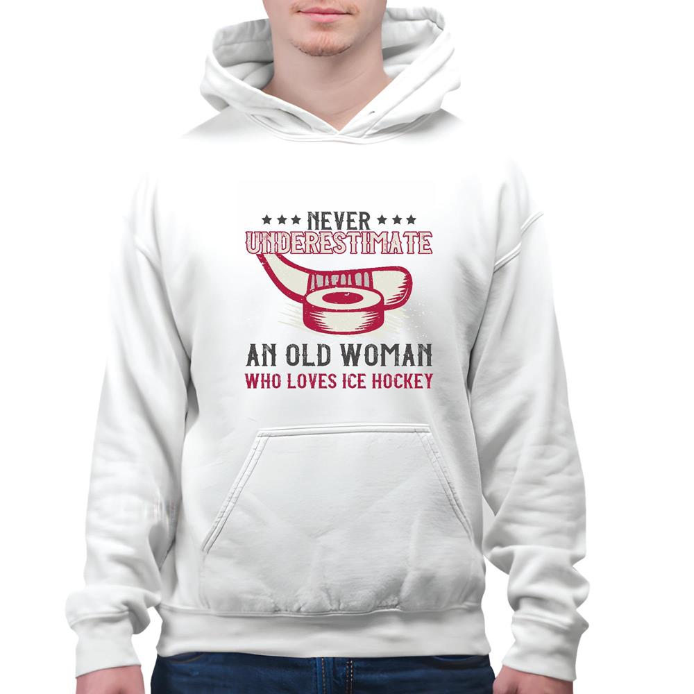 Never underestimate old woman loves Ice Hockey for Hockey woman lover White and Muticolor Unisex Hoodie