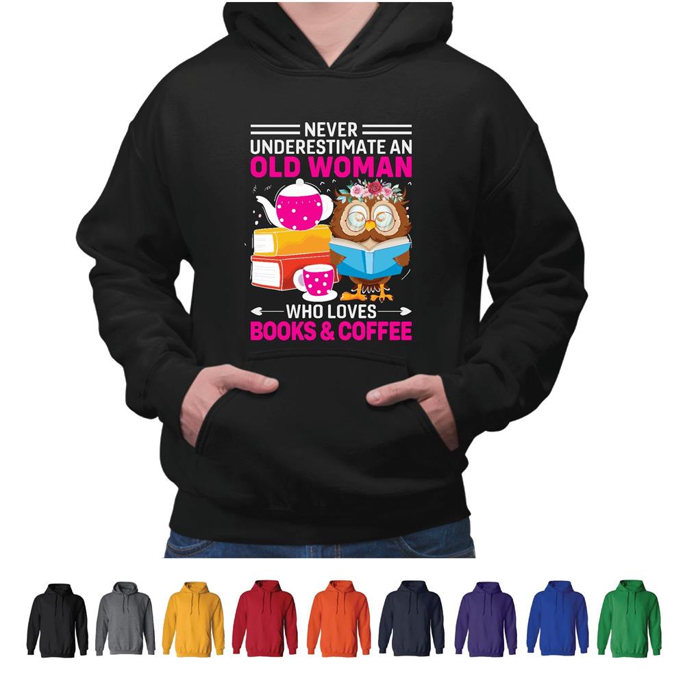 Never Underestimate Old Woman Who Loves Books Coffee Reader Gift Fun Humor Saying Black and Muticolor Unisex Hoodie