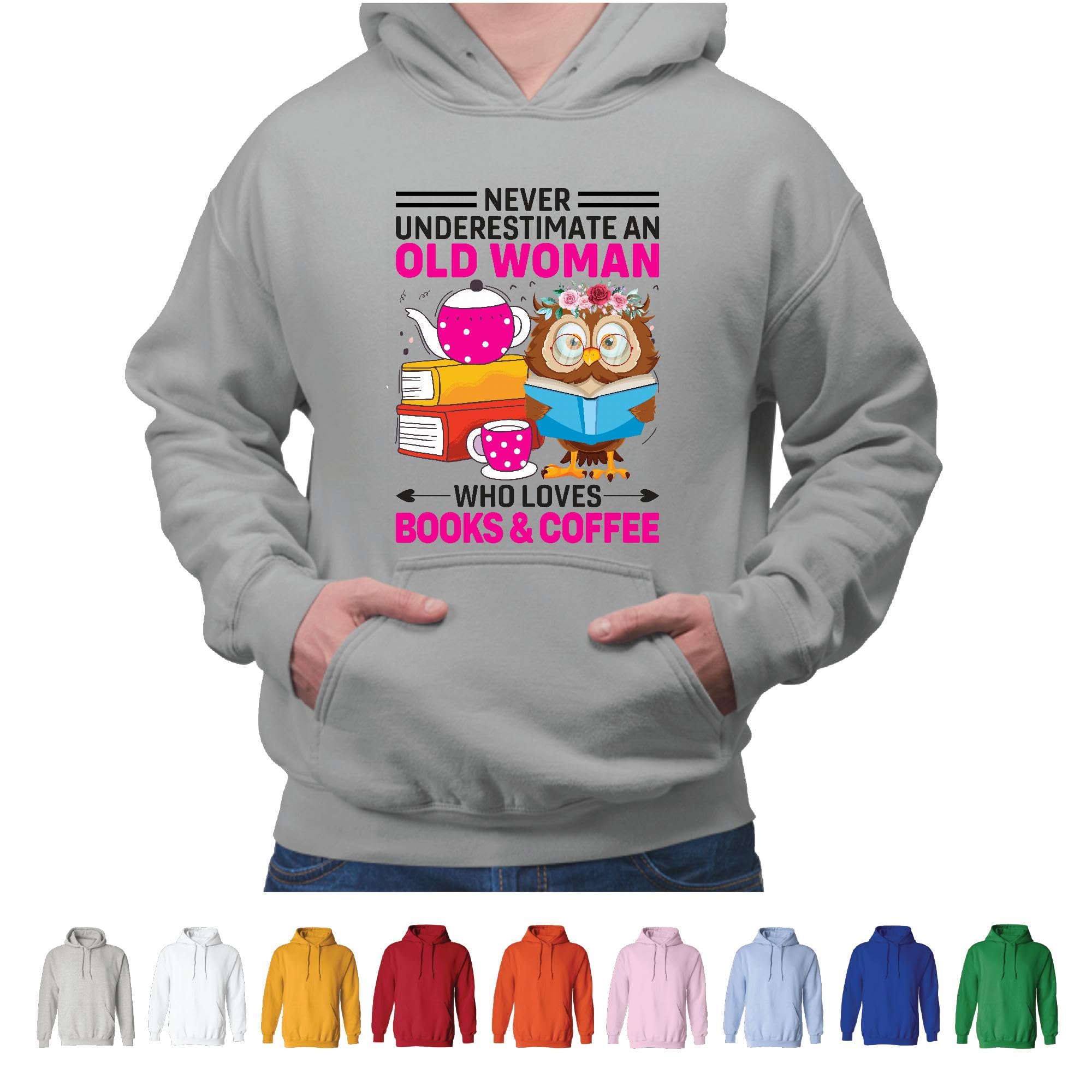 Never Underestimate Old Woman Who Loves Books Coffee Reader Gift Fun Humor Saying Gray and Muticolor Unisex Hoodie