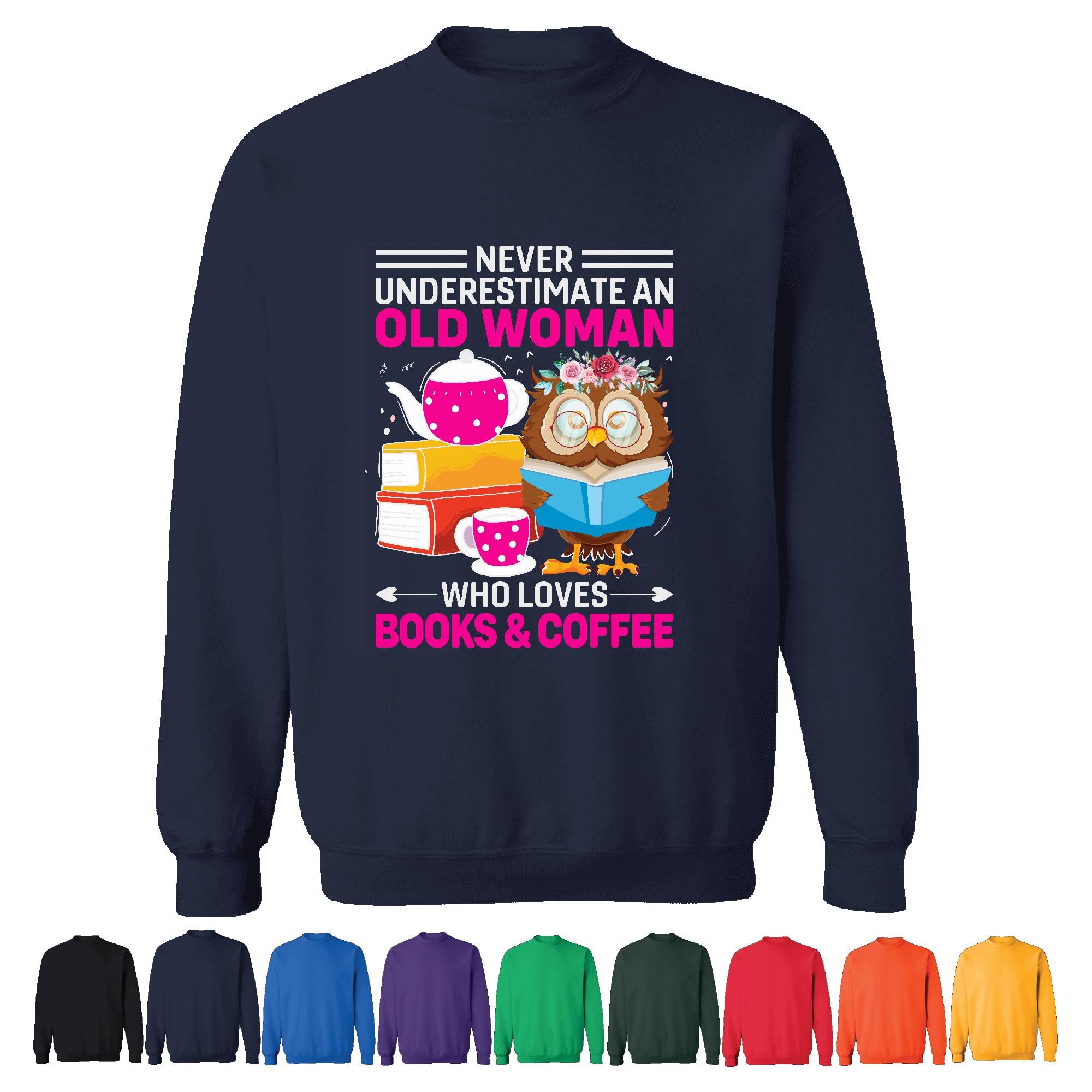 Never Underestimate Old Woman Who Loves Books Coffee Reader Gift Fun Humor Saying Navy Muticolor Unisex Sweatshirt