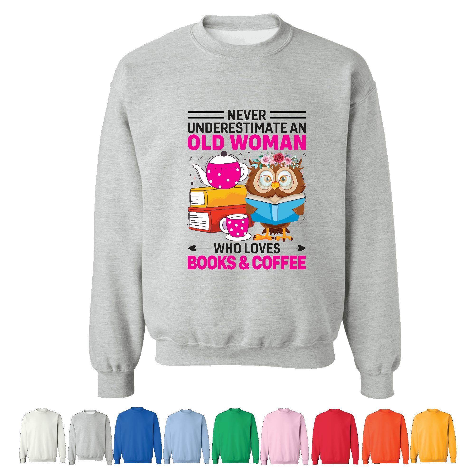 Never Underestimate Old Woman Who Loves Books Coffee Reader Gift Fun Humor Saying Grey Muticolor Unisex Sweatshirt