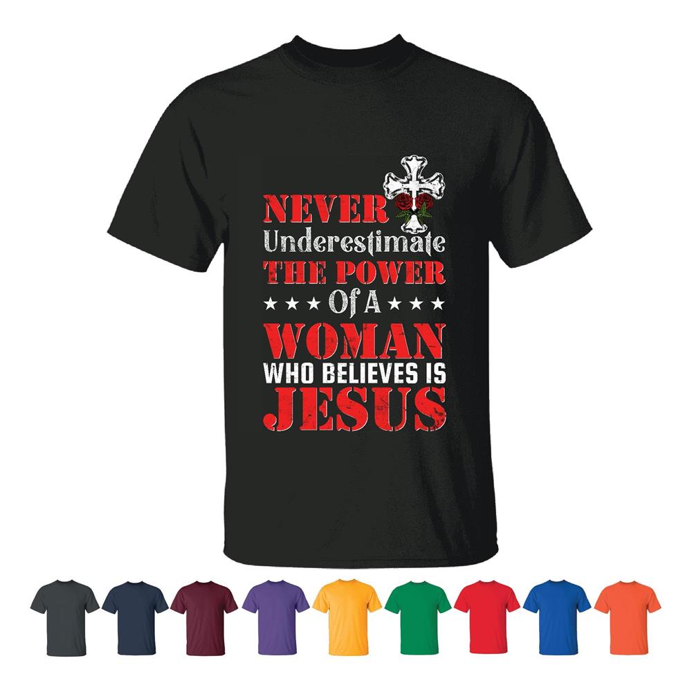 Never underestimate the power of a woman who believes in Jesus God Believer Christian Men Women Black T shirt