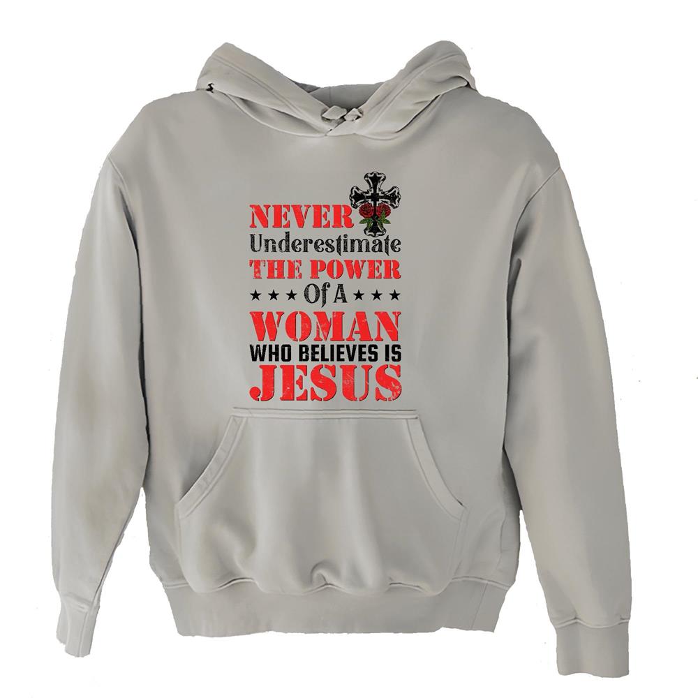 Never underestimate the power of a woman who believes in Jesus God Believer Christian Gray and Muticolor Unisex Hoodie