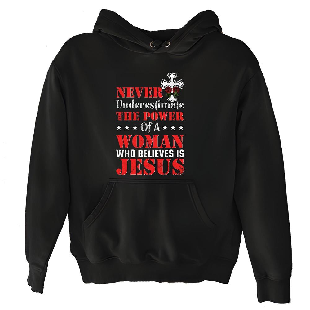 Never underestimate the power of a woman who believes in Jesus God Believer Christian Black and Muticolor Unisex Hoodie