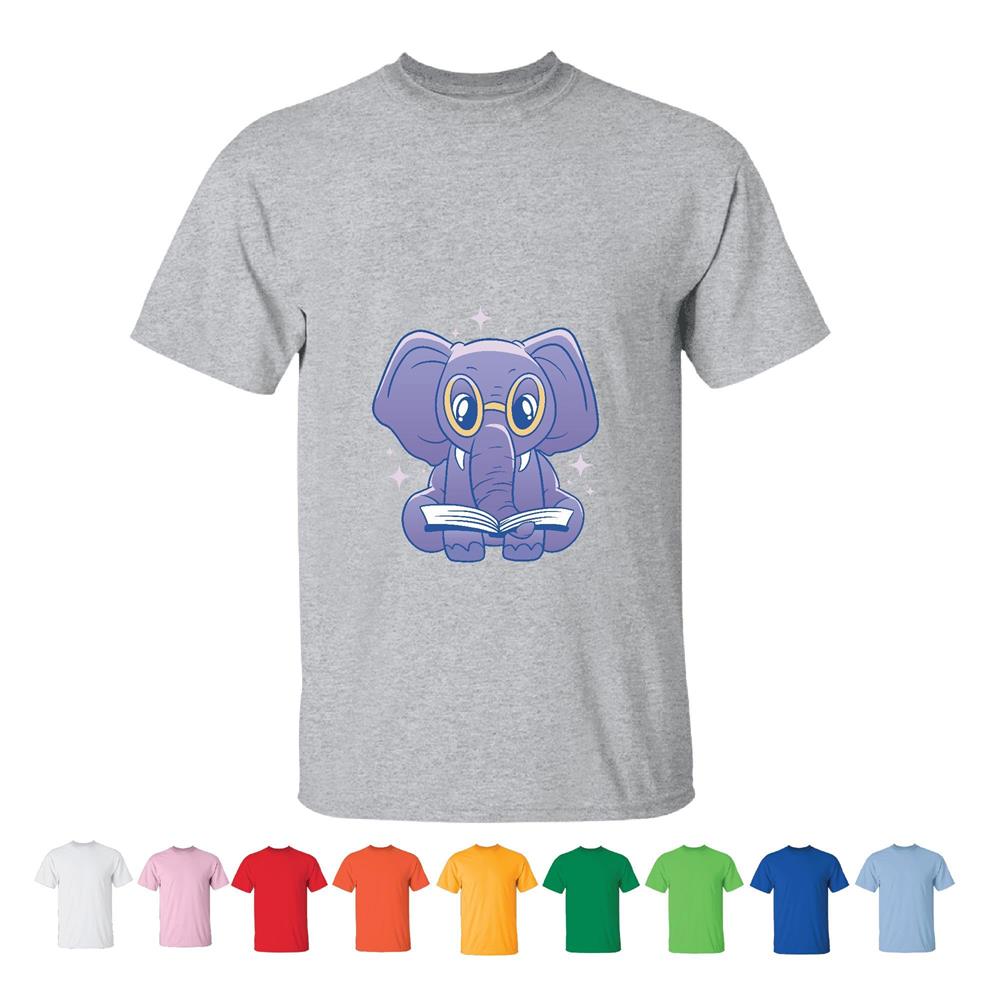 Novelty Gift for Book Lovers Elephant with Reading Glasses Printed Design for Adults Men Women White Gray T shirt