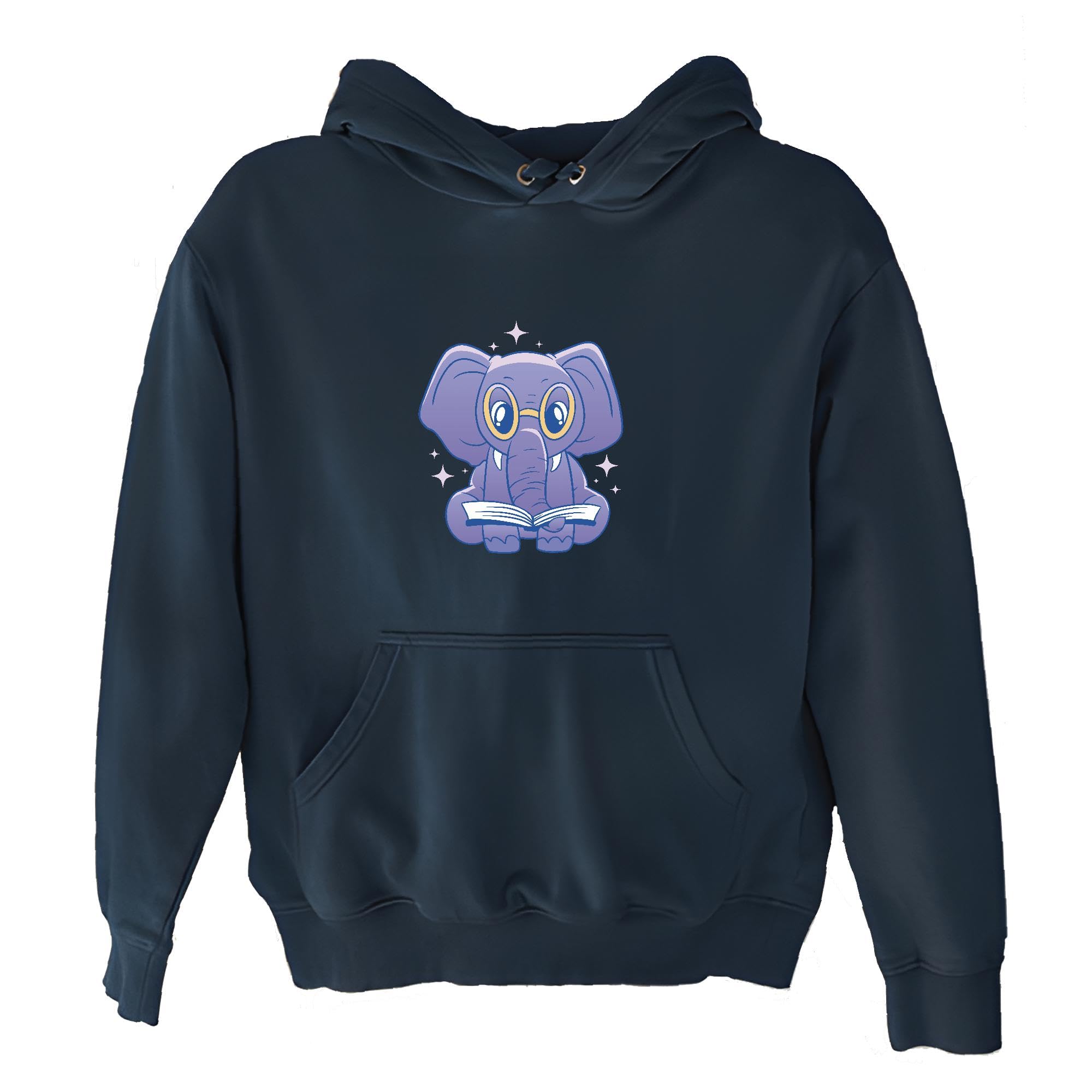 Novelty Gift for Book Lovers Elephant with Reading Glasses Printed Design for Adults Navy and Muticolor Unisex Hoodie