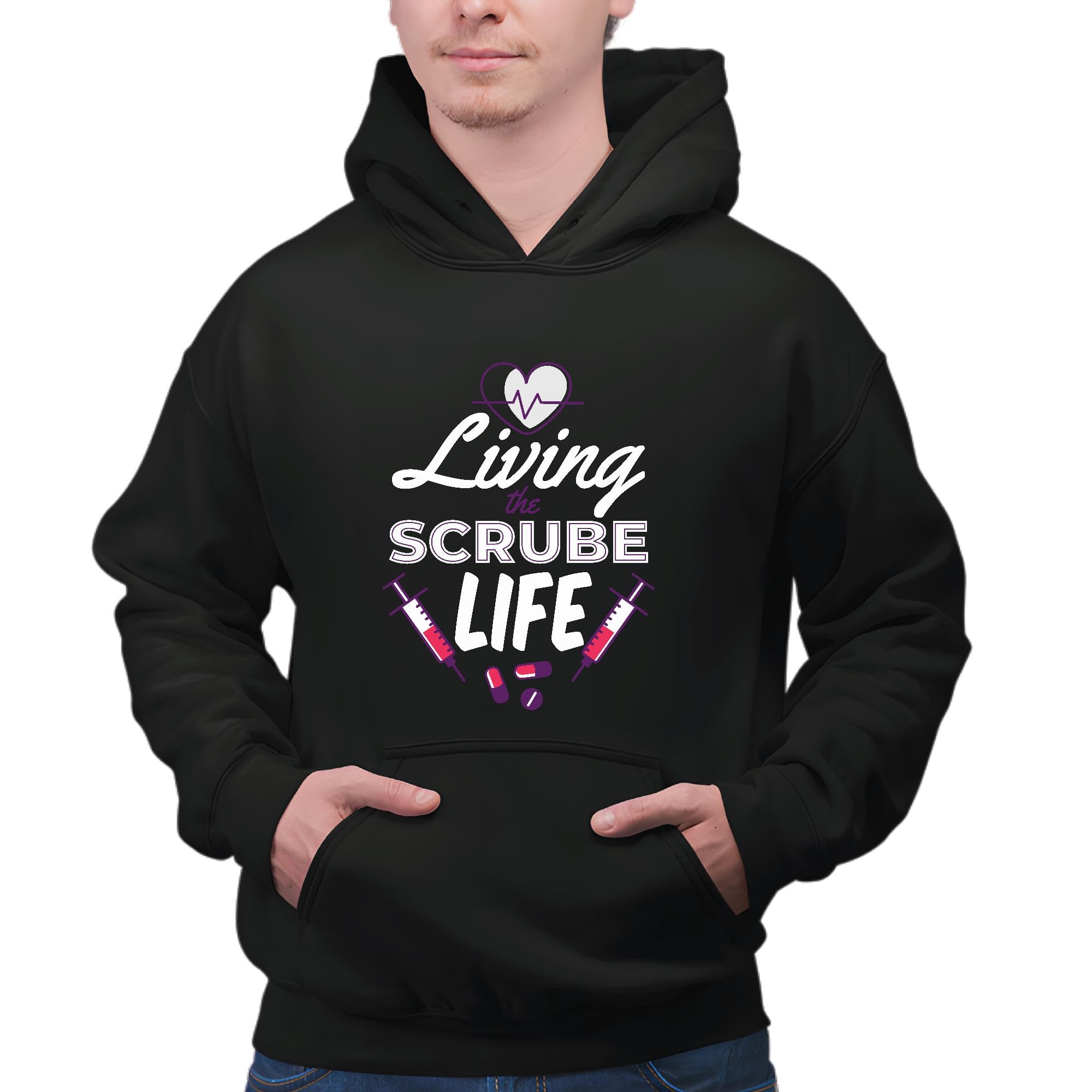 Nurse Gift Living the Scrub Life Quote with Medical Elements for Healthcare Professionals Black and Muticolor Unisex Hoodie