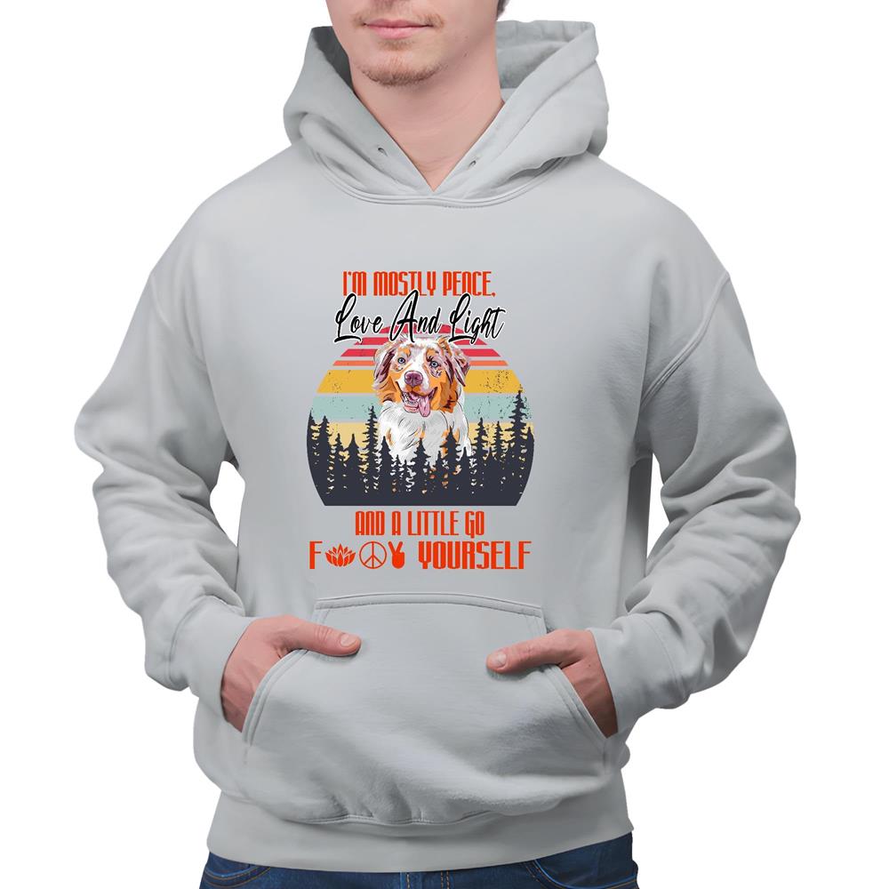 Peace Love Light Australian Shepherd Gift for Humor Lovers Gray and Muticolor Unisex Hoodie