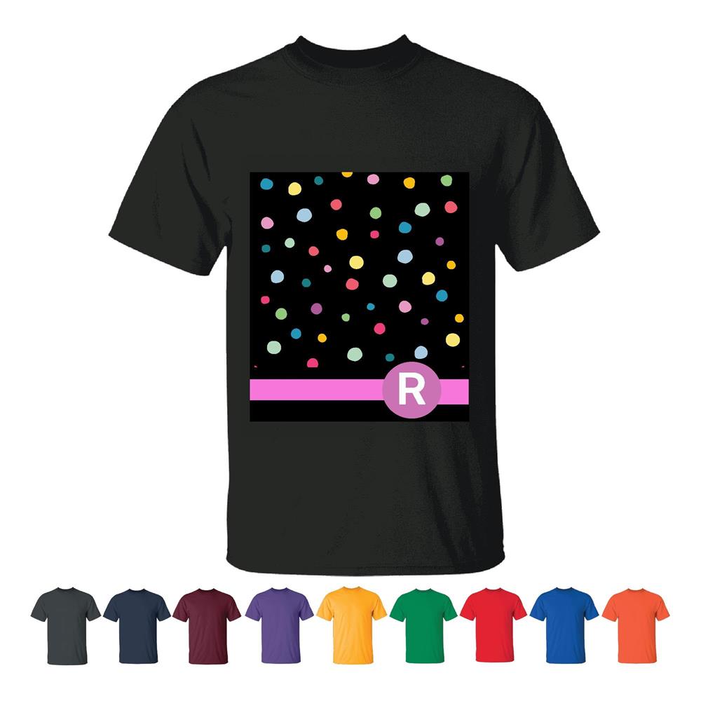 Personalized Gift with Letter R Monogrammed on Rainbow Polka Dots Pattern Hot Pink Initials Men Women Black T shirt