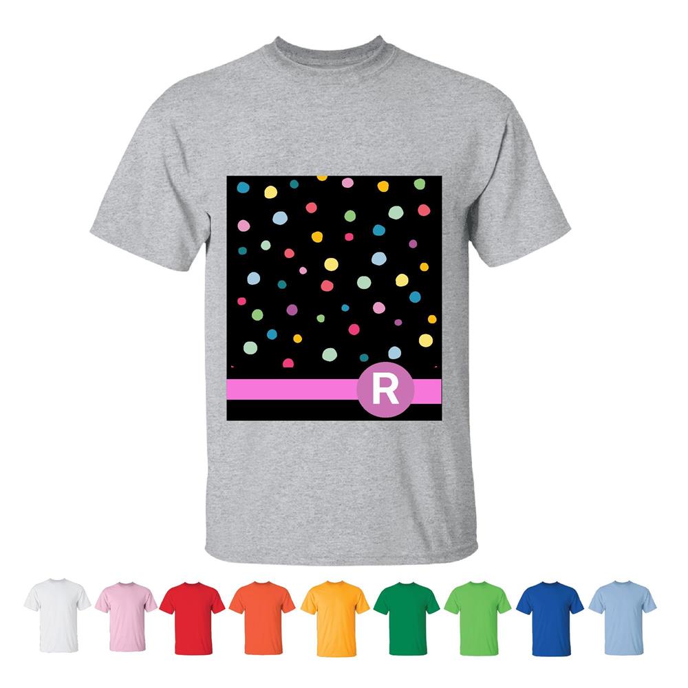 Personalized Gift with Letter R Monogrammed on Rainbow Polka Dots Pattern Hot Pink Initials Men Women White Gray T shirt