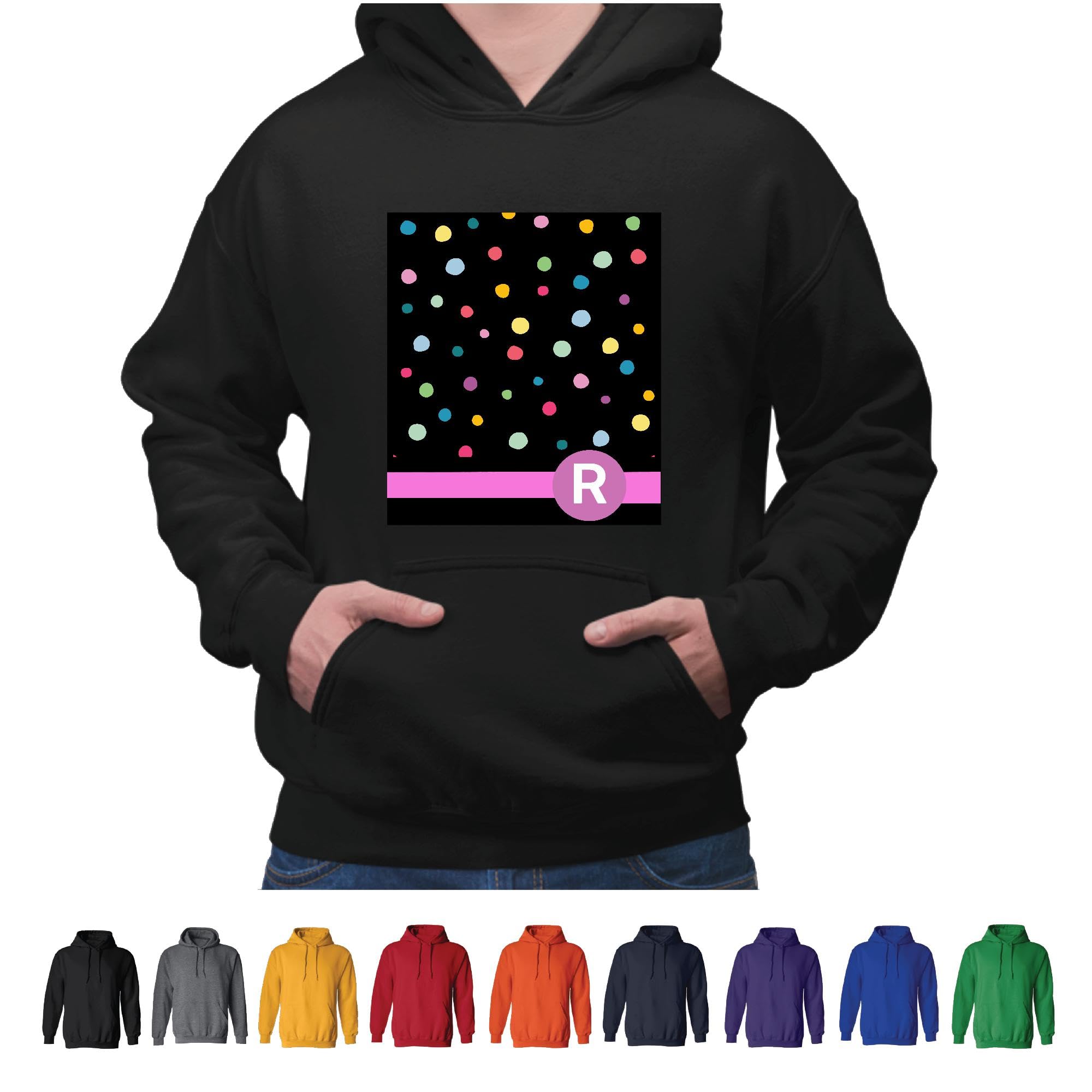 Personalized Gift with Letter R Monogrammed on Rainbow Polka Dots Pattern Hot Pink Initials Black and Muticolor Unisex Hoodie