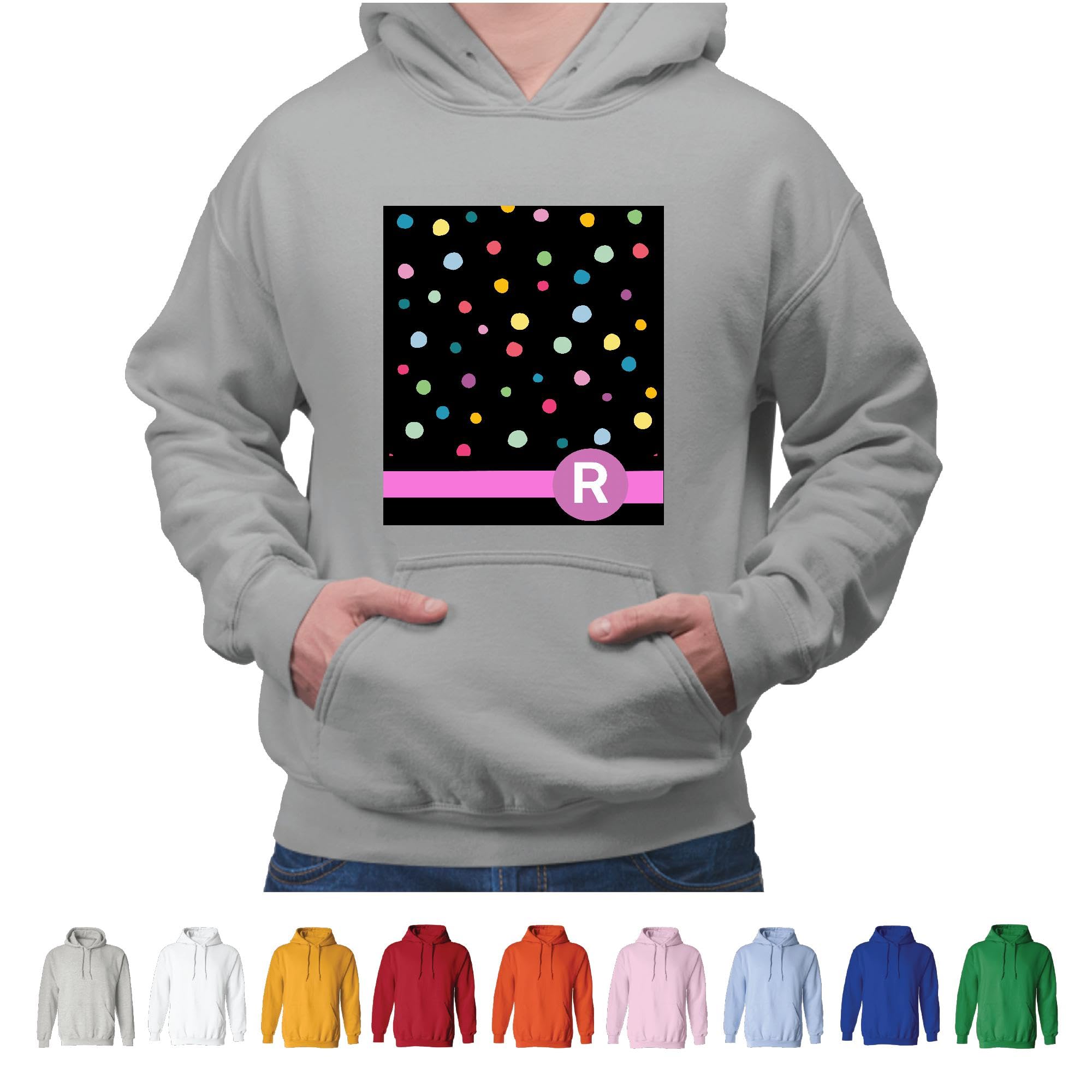Personalized Gift with Letter R Monogrammed on Rainbow Polka Dots Pattern Hot Pink Initials Gray and Muticolor Unisex Hoodie