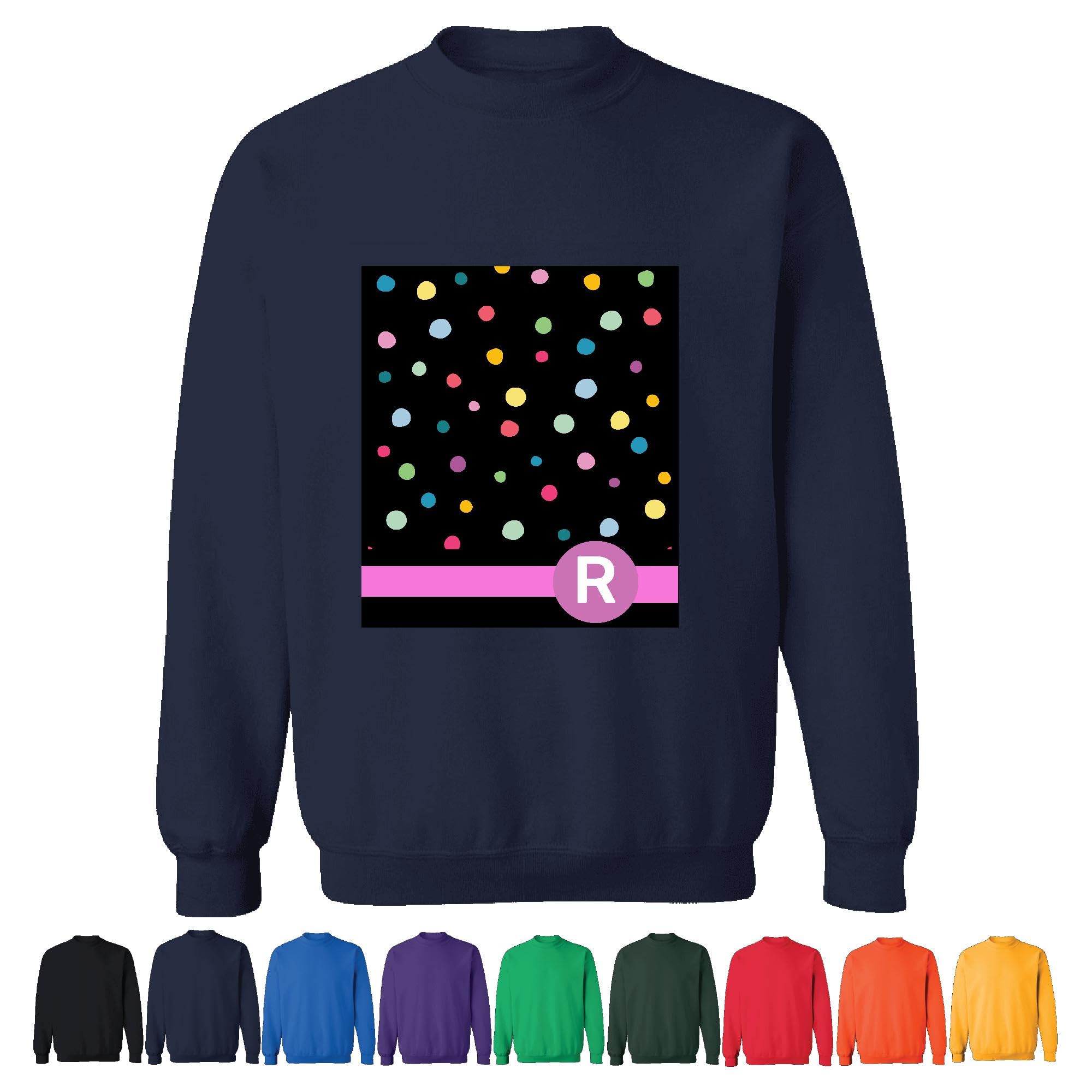 Personalized Gift with Letter R Monogrammed on Rainbow Polka Dots Pattern Hot Pink Initials Navy Muticolor Unisex Sweatshirt