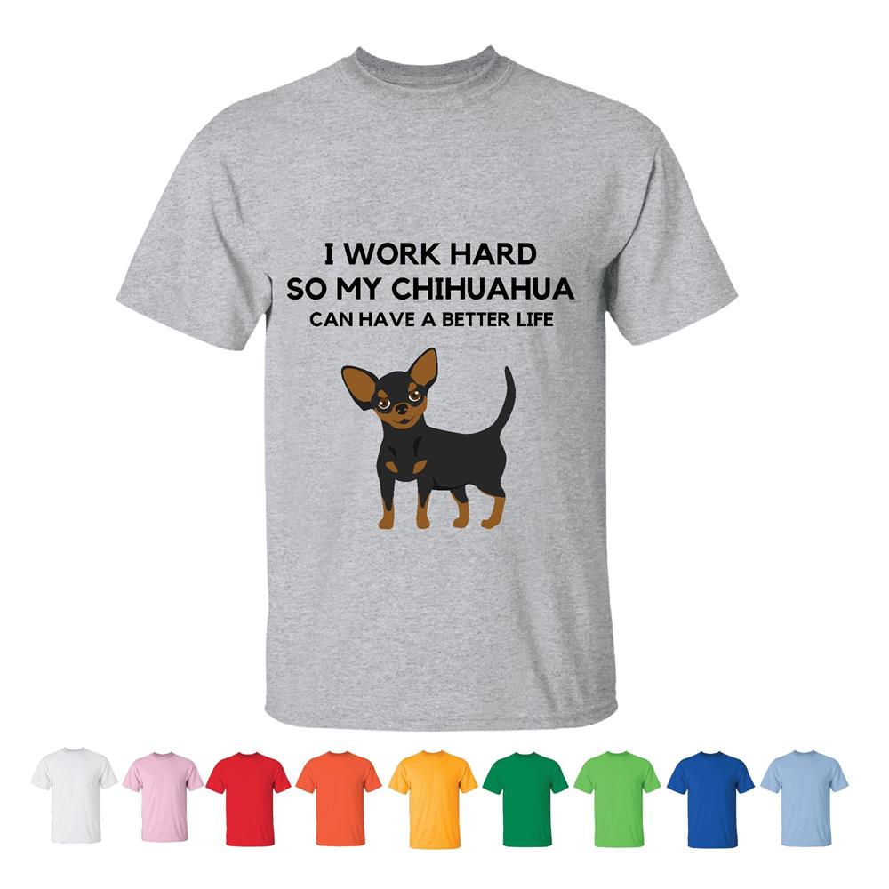 Pet Dog Lover Gift with I Work Hard So My Chihuahua Can Have aHumor for Chihuahua Lovers Men Women White Gray T shirt