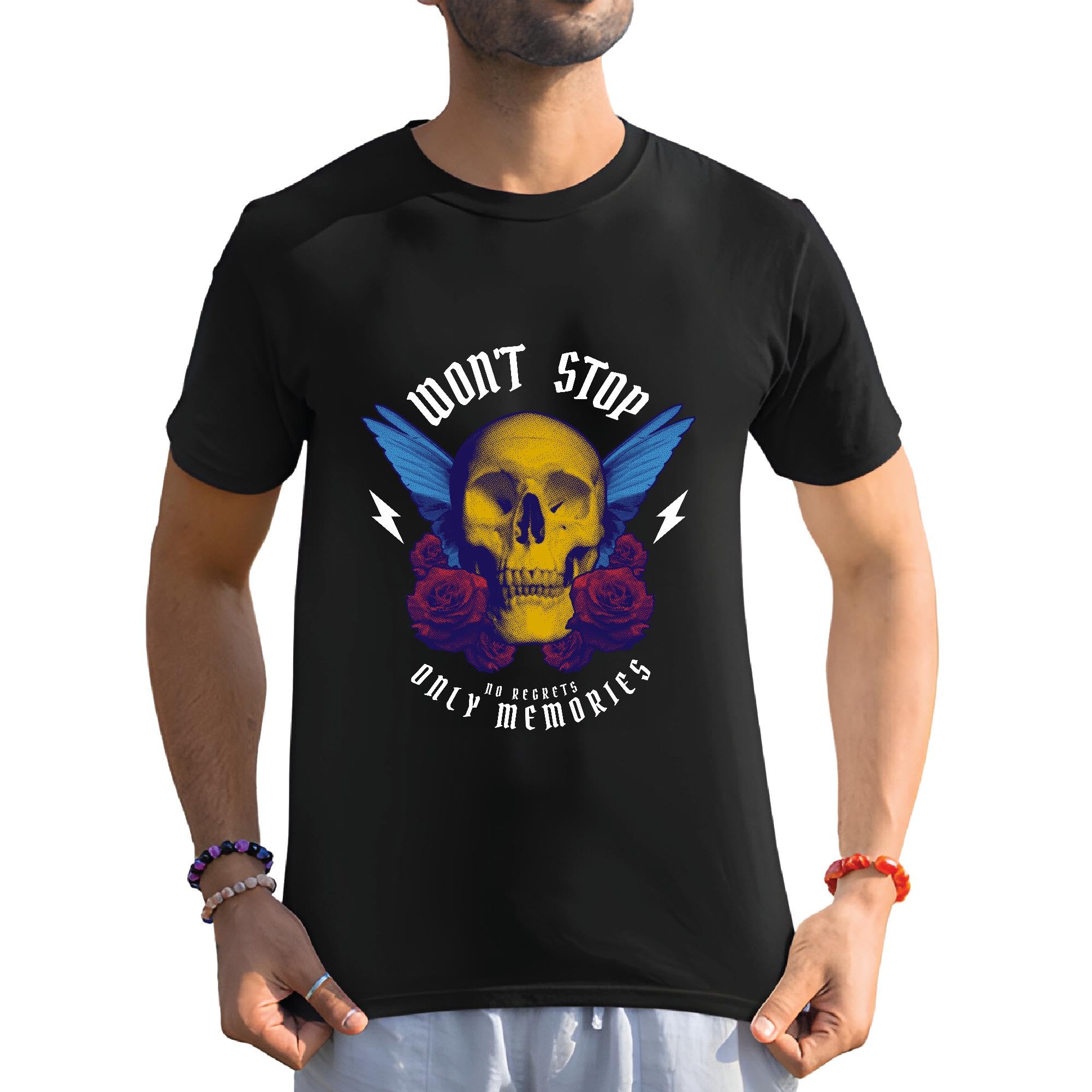 Photographic Skull with Wings and Roses Gift for Memory Keepers Unisex Men Women Black Multicolor T shirt