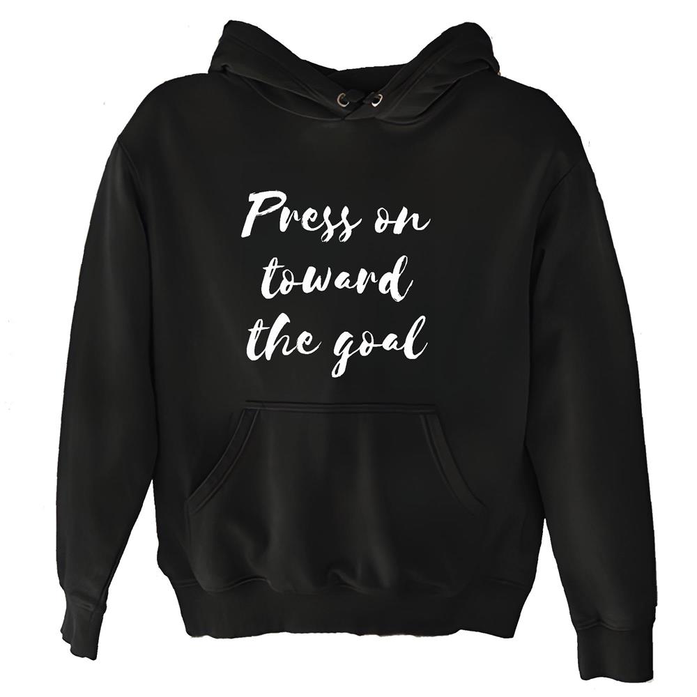 Press on toward the goal Phil 3 14 inspirational Christian Bible verse Jesus Faith Black and Muticolor Unisex Hoodie