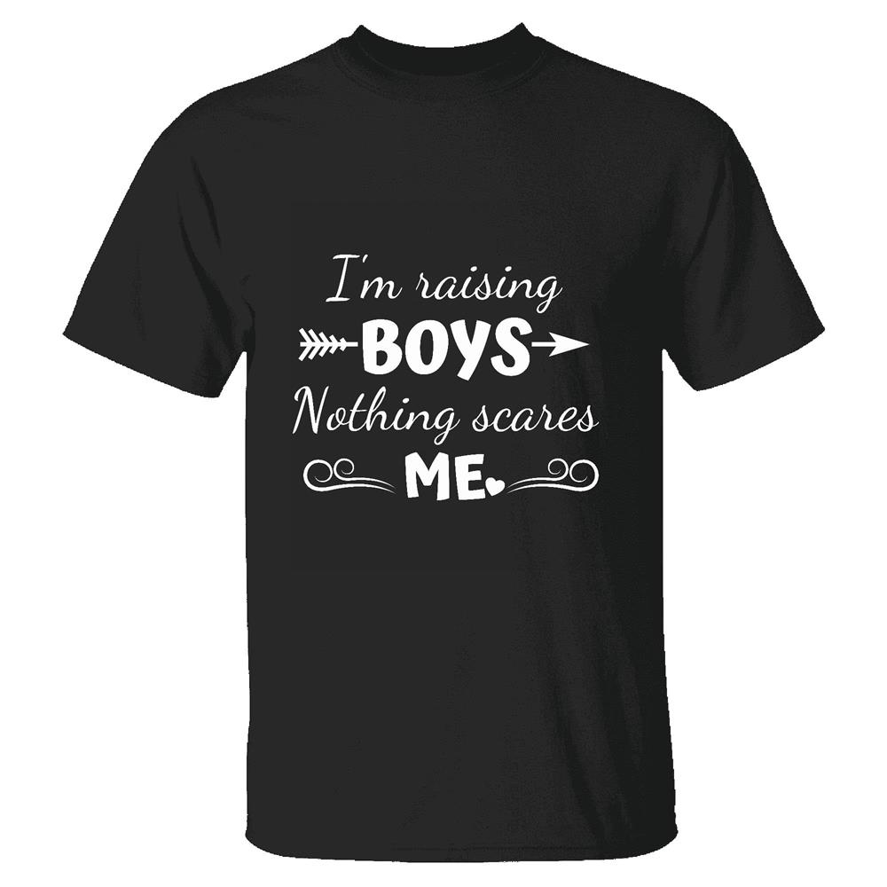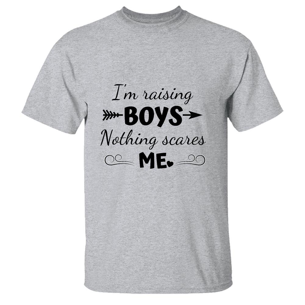 Proud Mom Gift for Raising Boys Nothing Scares Me Men Women White Gray Multicolor T shirt
