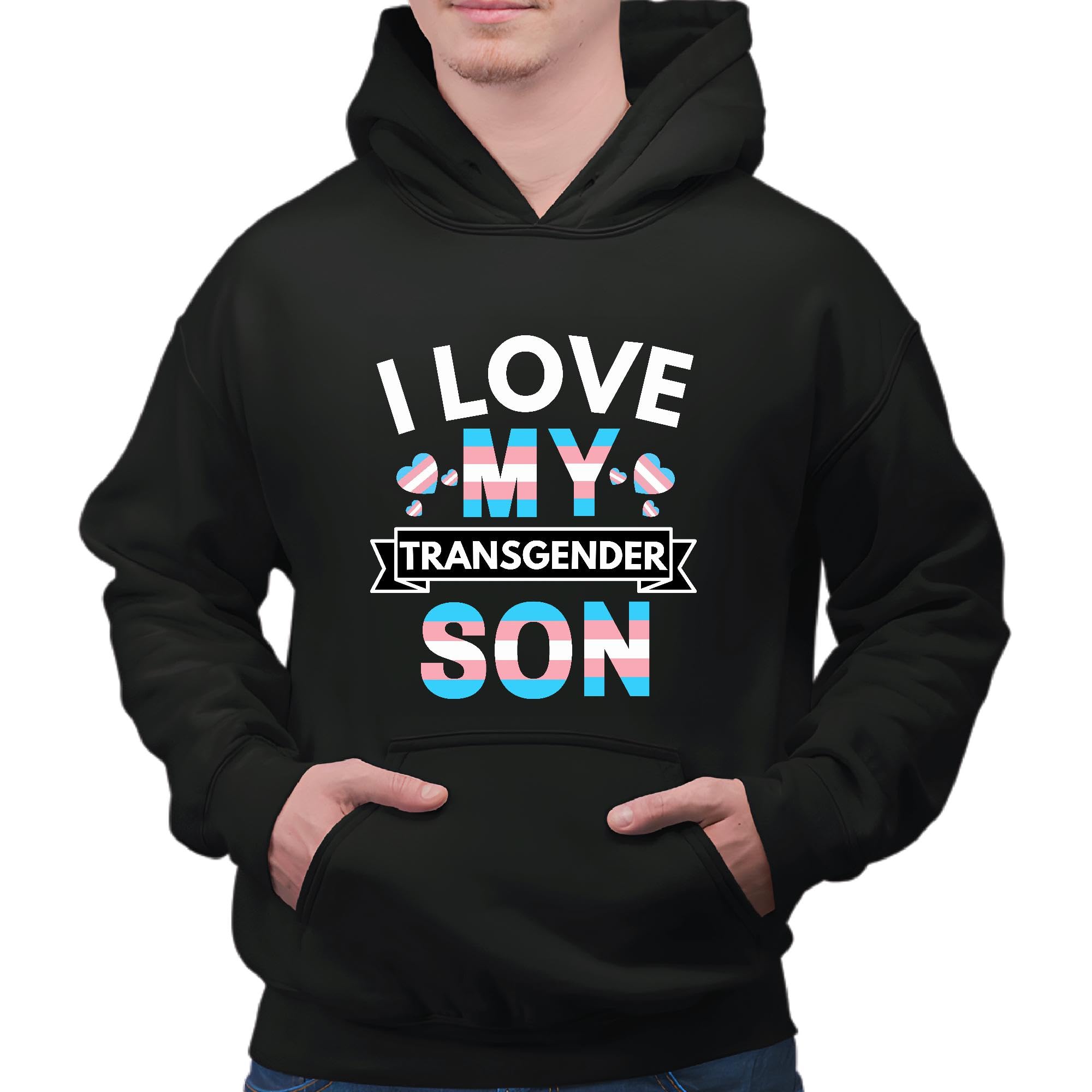 Proud Mom LGBT support trans flag heart pattern I love my Transgender son printed LGBTQ Black and Muticolor Unisex Hoodie