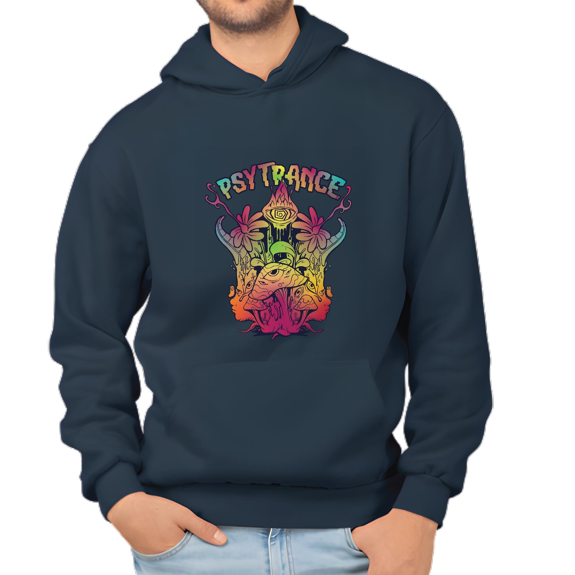 Psychedelic Gift for Psytrance Fans Mushroom Illustration Navy and Muticolor Unisex Hoodie