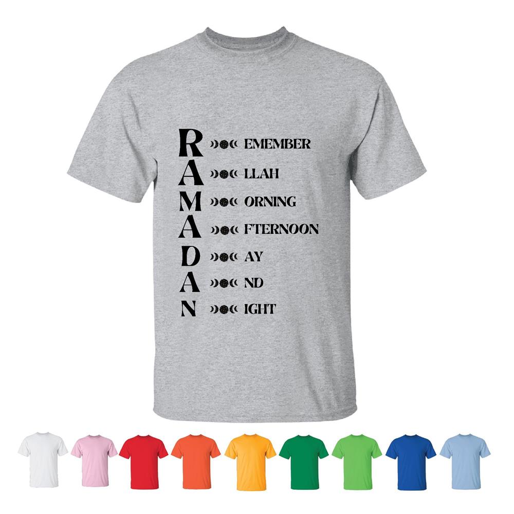 Ramadan Mubarak Gifts for Muslim Islamic Fasting Pray Remember Allah Morning Afternoon Day Night Men Women White Gray T shirt
