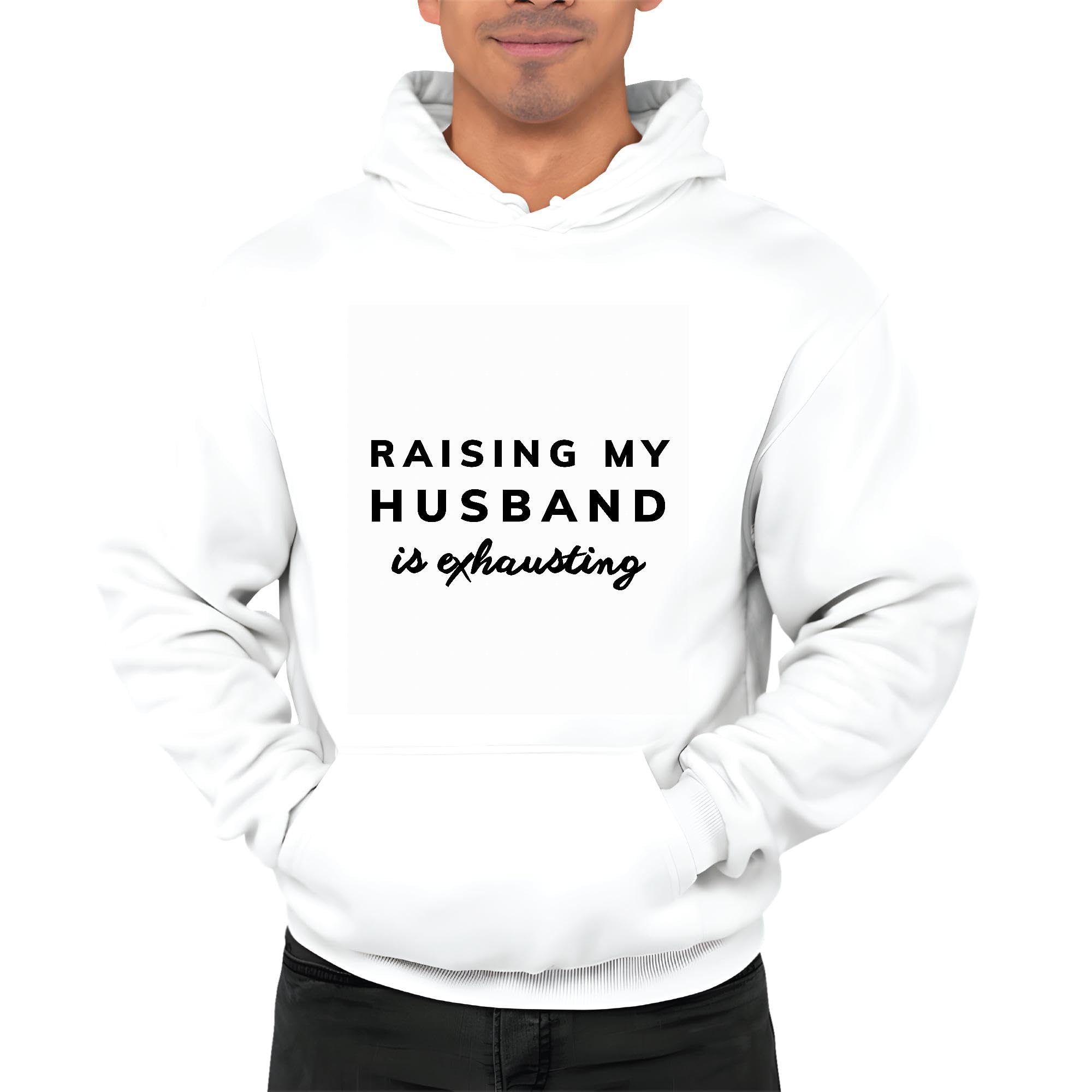 Raising my Husband is Exhausting funny saying from Wife White and Muticolor Unisex Hoodie