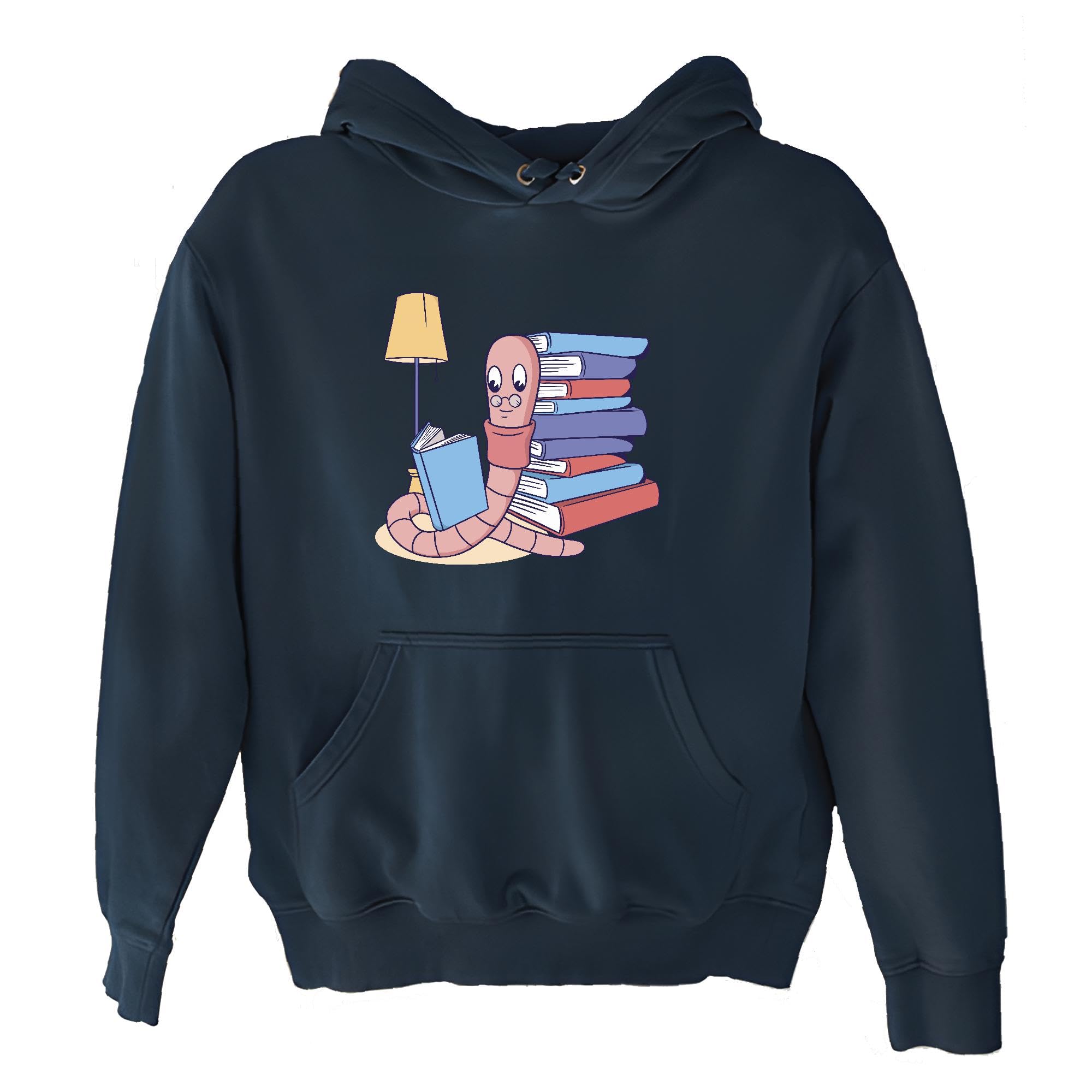 Read Gift for Book Lovers Worm Character Wearing Glasses Book Print Design Navy and Muticolor Unisex Hoodie