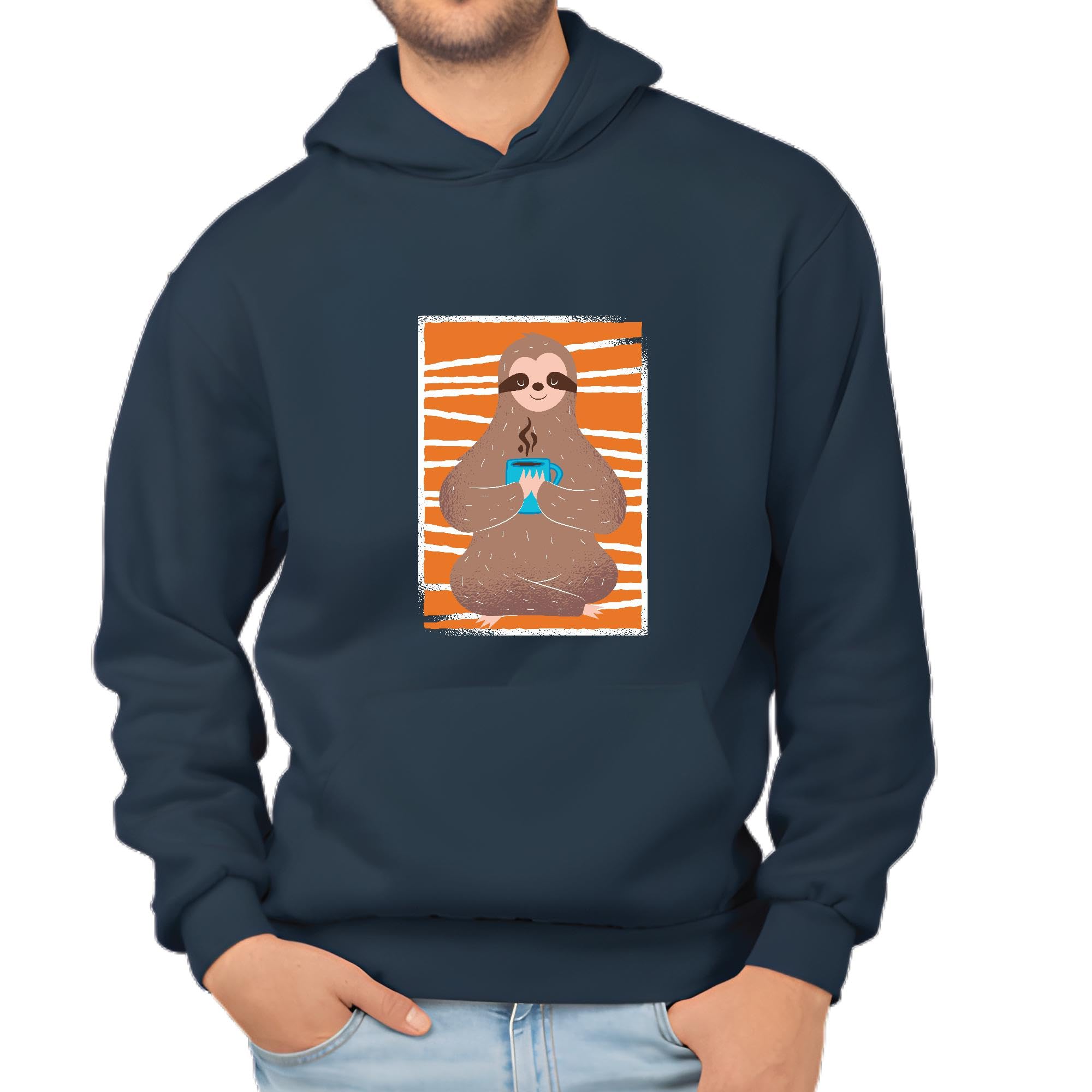 Relaxed Sloth Drinking Coffee Gift for Animal Lovers for All Ages Navy and Muticolor Unisex Hoodie