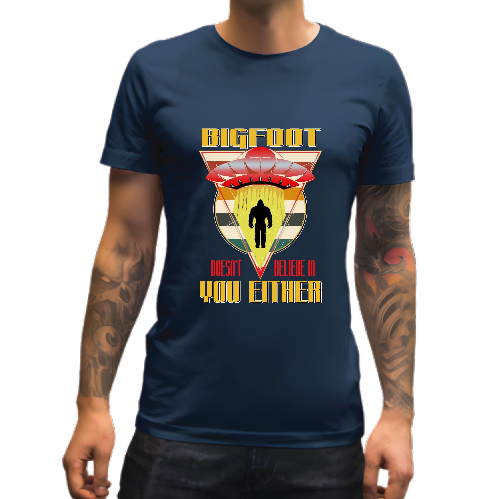 Retro Bigfoot UFO Humor Vintage Fictional Character for Occult Lover Men Women Navy Multicolor T shirt