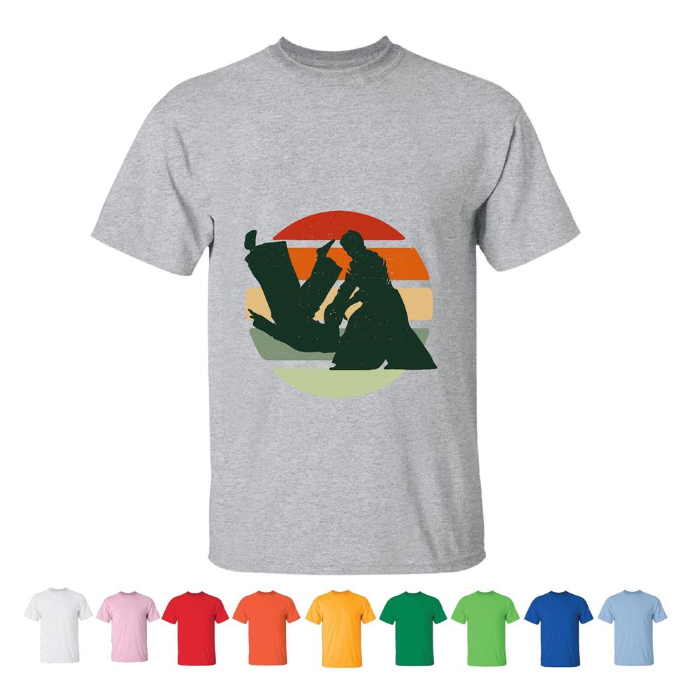 Retro Sunset Jiujitsu Gift for Martial Arts Lovers Two People Practicing Jujutsu Retro Sunset Men Women White Gray T shirt