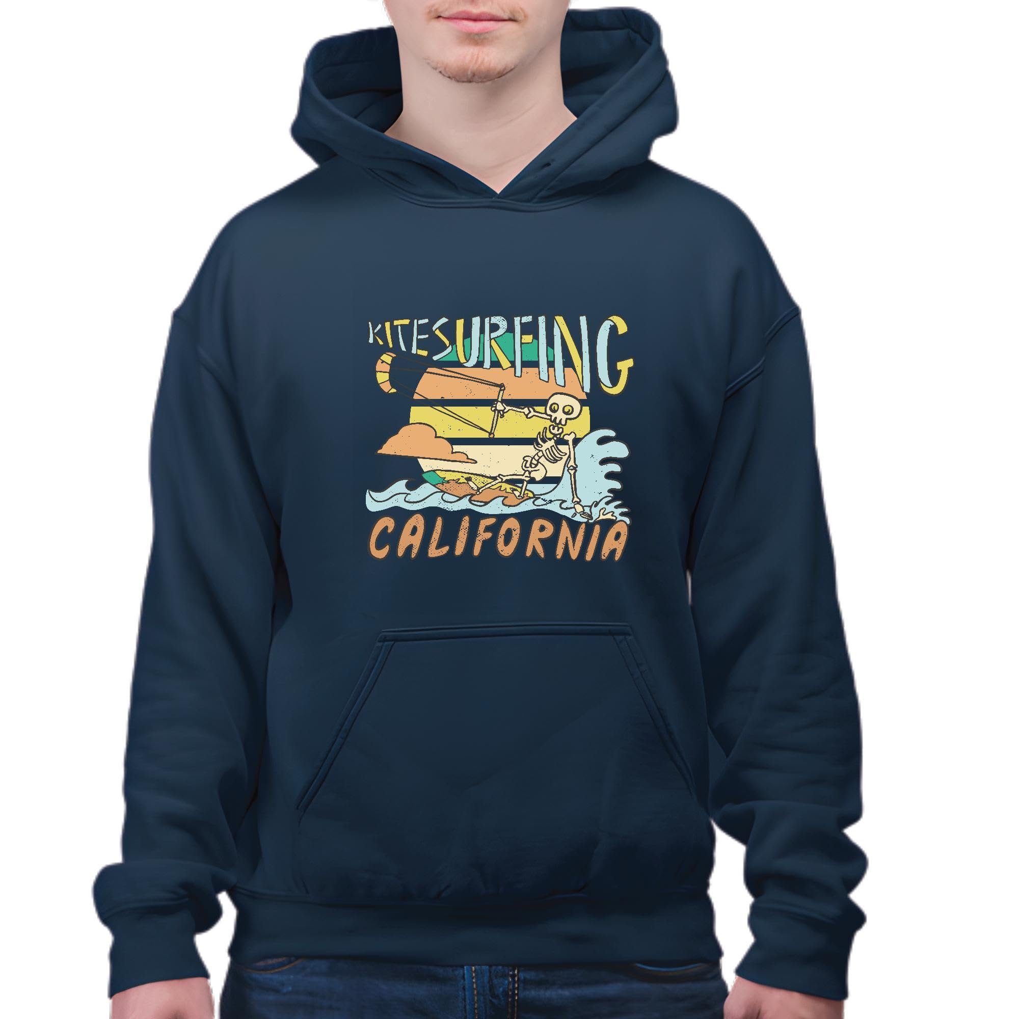 Retro Sunset Kitesurfing Skeleton Gift for Winter Sports Fans Navy and Muticolor Unisex Hoodie