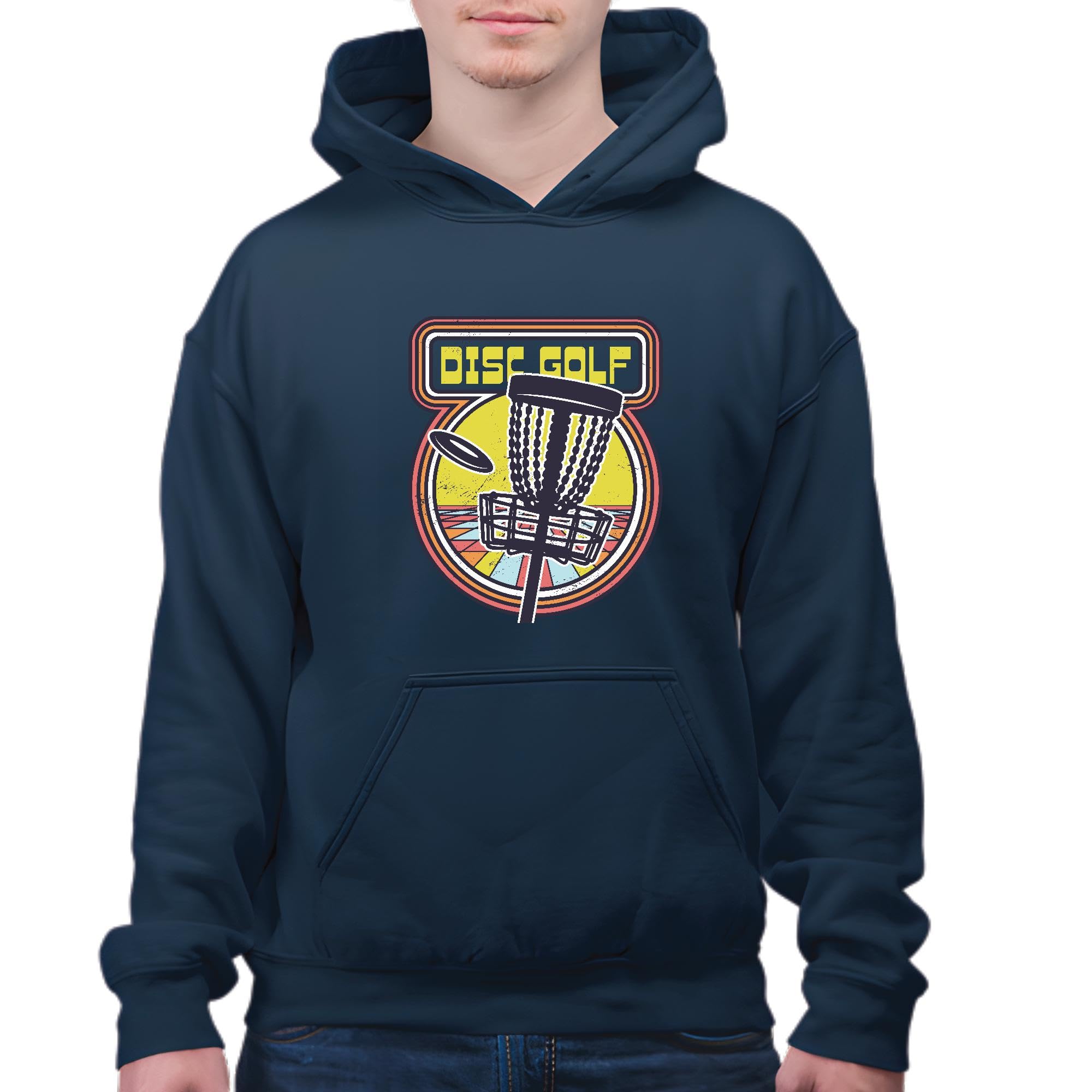 Retro Videogame Disc Golf Theme Gift for Gamers Navy and Muticolor Unisex Hoodie