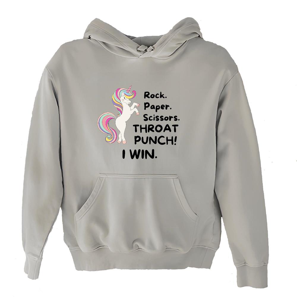 Rock Paper Scissors throat punch I win Unicorn humor White and Muticolor Unisex Hoodie