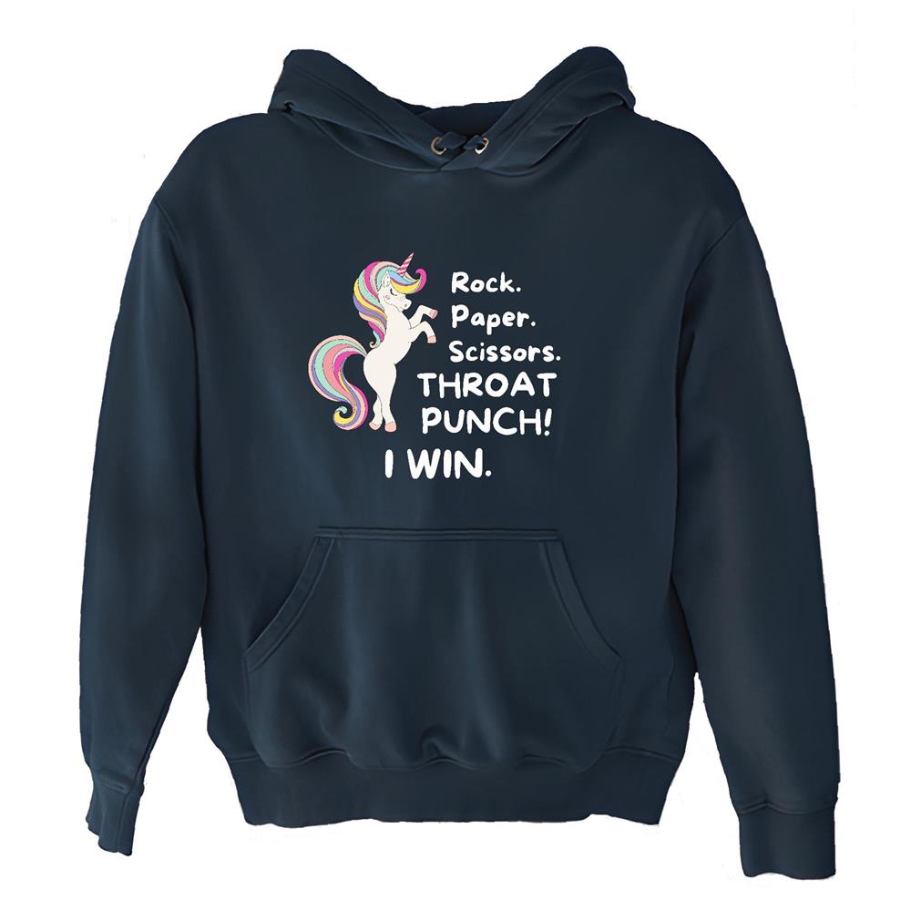 Rock Paper Scissors throat punch I win Unicorn humor Navy and Muticolor Unisex Hoodie