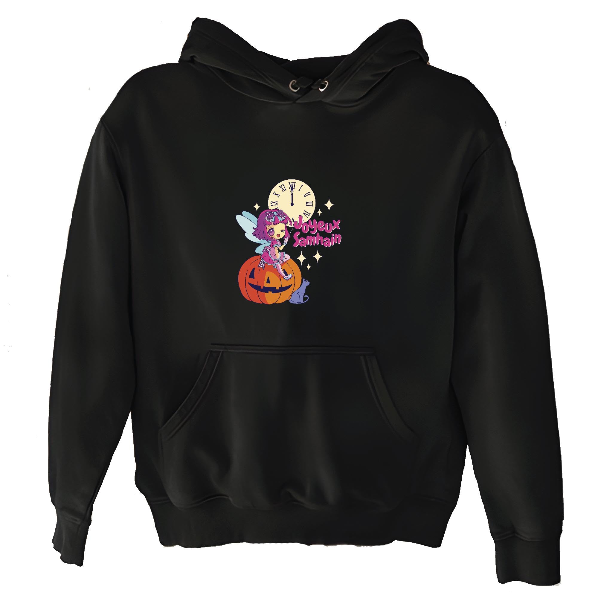 Samhain Gift Chibi Fairy Godmother with Black Cat Clock and Quote for Fairy Lovers Black and Muticolor Unisex Hoodie