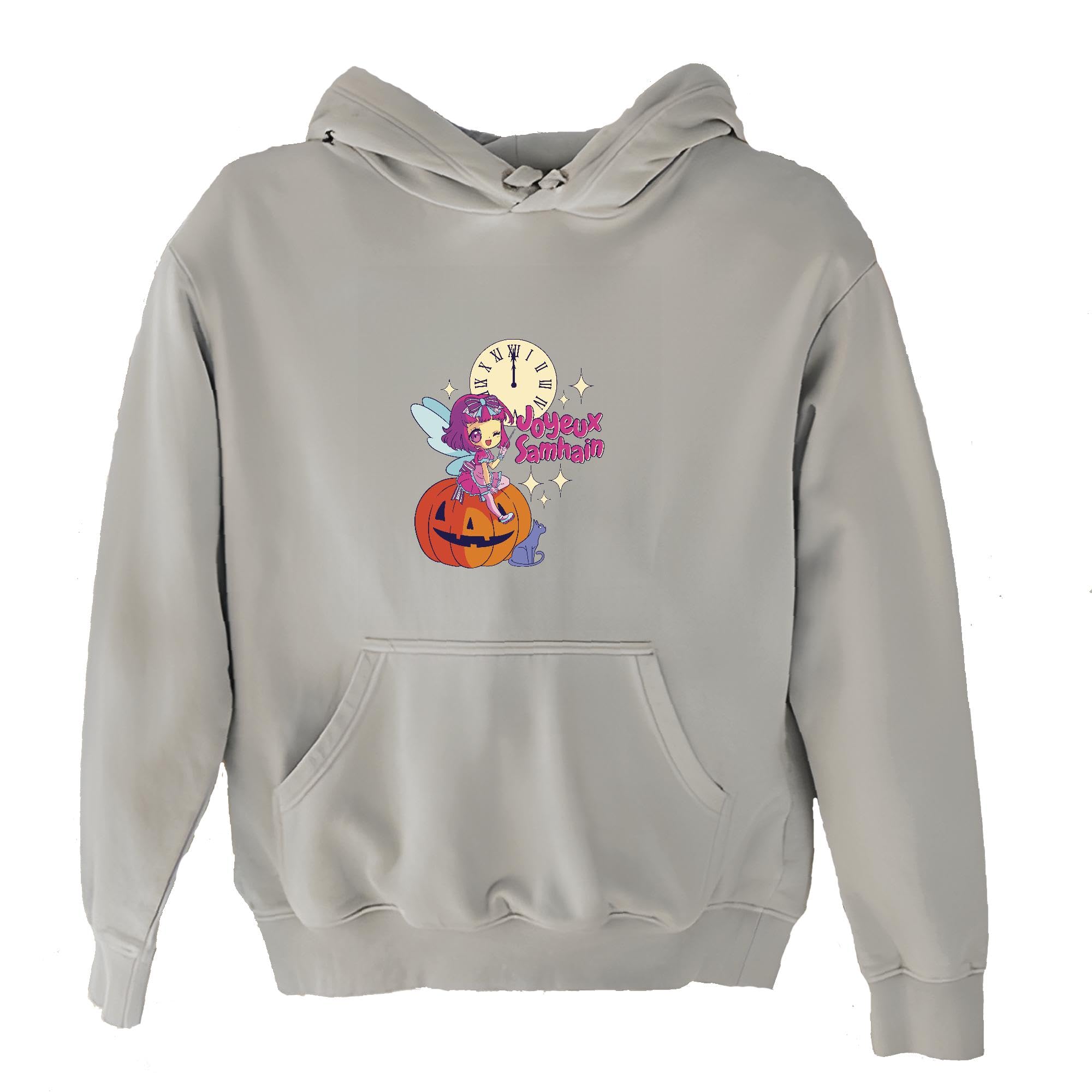 Samhain Gift Chibi Fairy Godmother with Black Cat Clock and Quote for Fairy Lovers Gray and Muticolor Unisex Hoodie