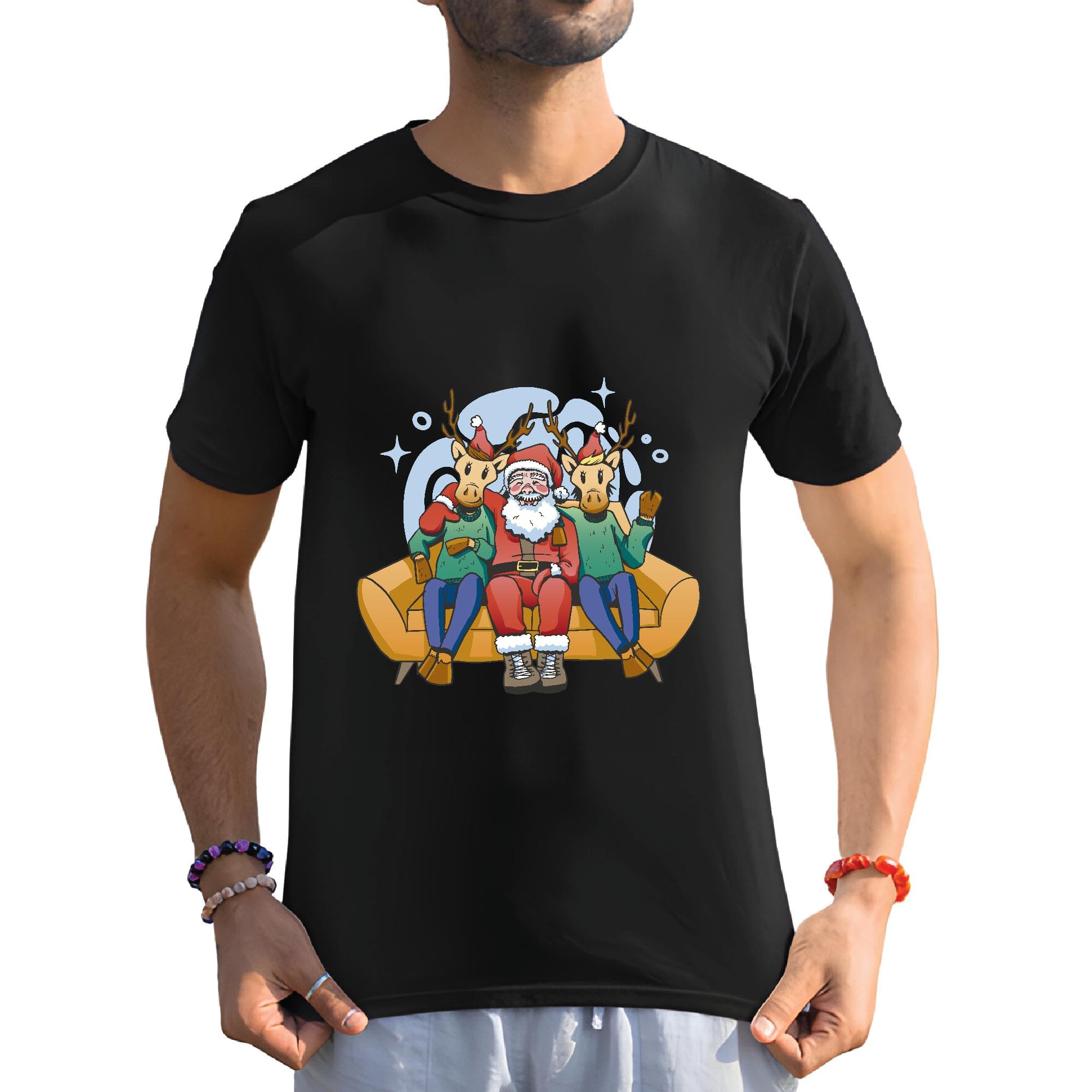 Santa Claus Funny Gift Illustration Style Reindeer Sofa Design for Kids and Adults Men Women Black Multicolor T shirt