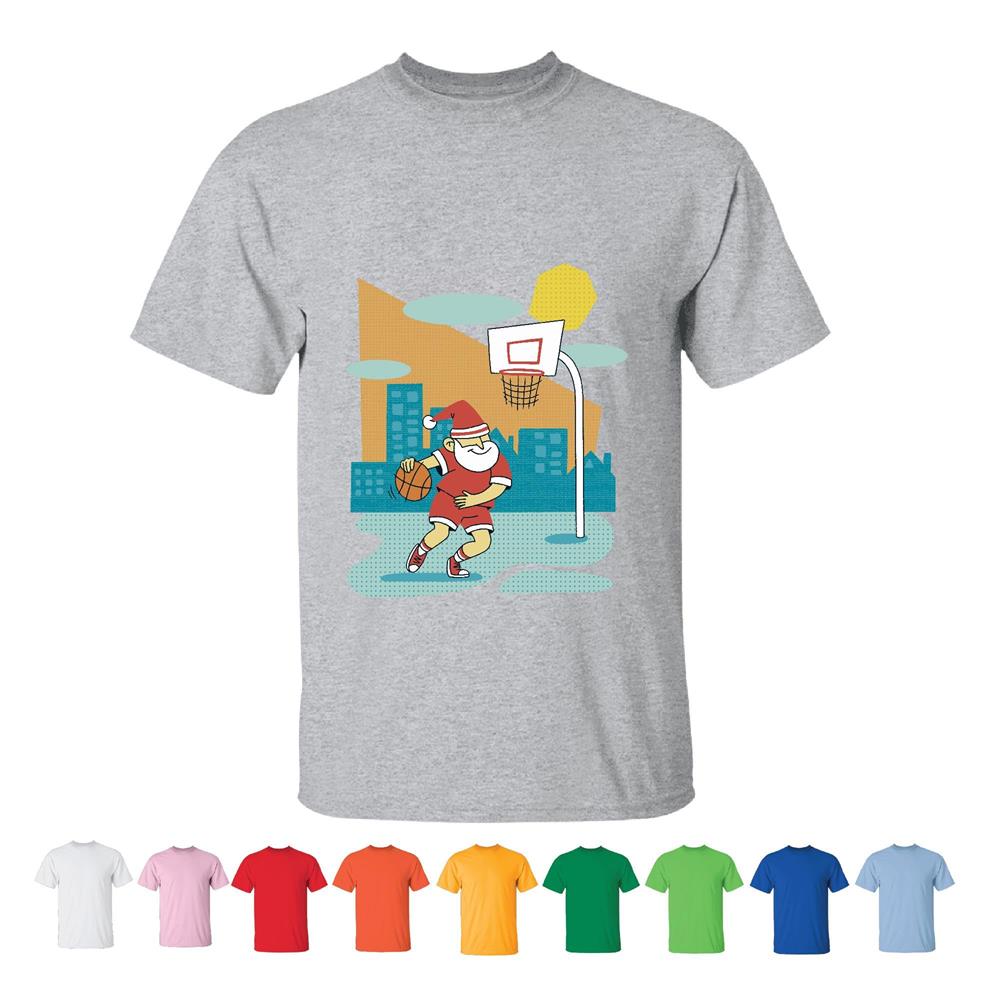 Santa Playing Basketball Cartoon Style Sports Gift for Kids and Adults Men Women White Gray T shirt