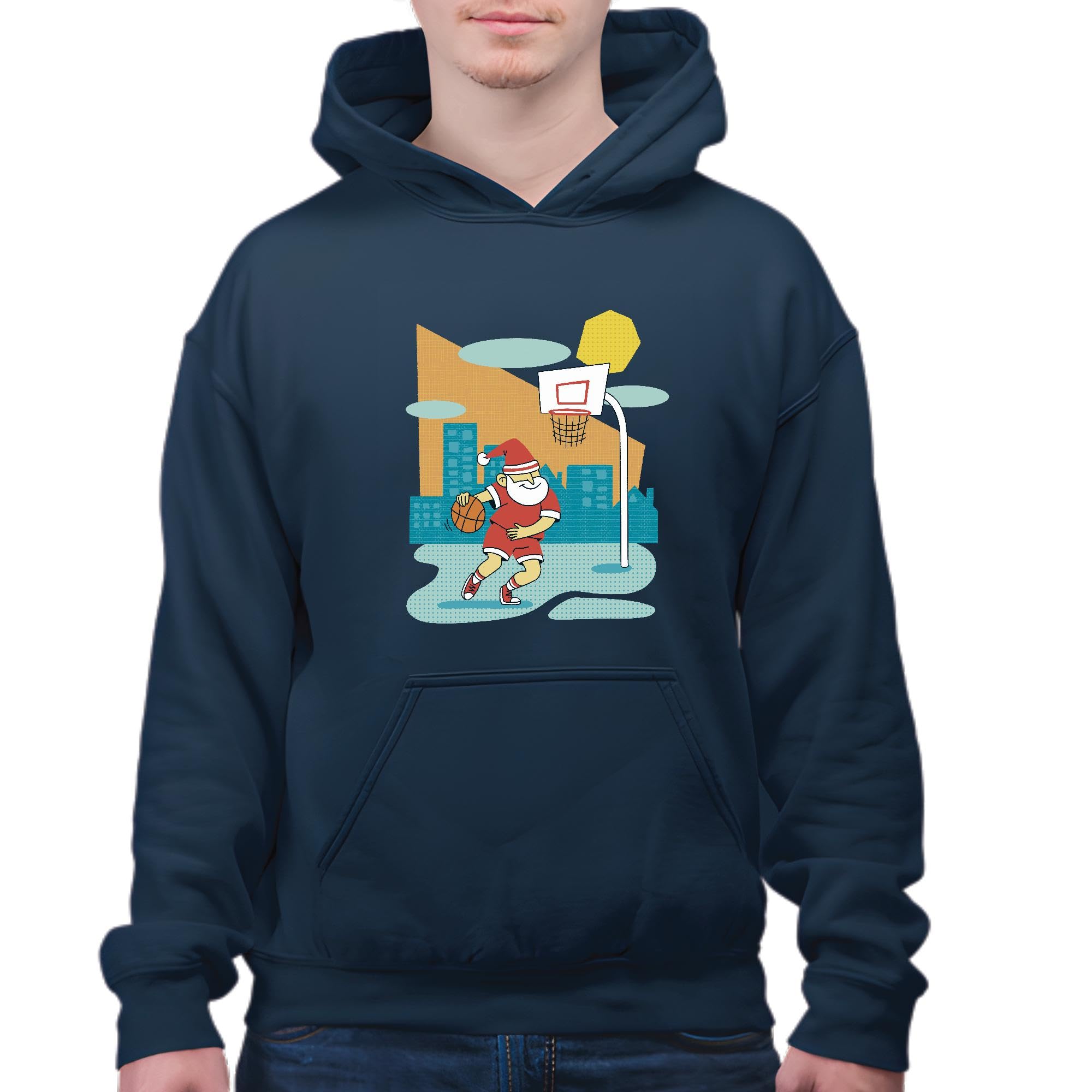 Santa Playing Basketball Cartoon Style Sports Gift for Kids and Adults Navy and Muticolor Unisex Hoodie